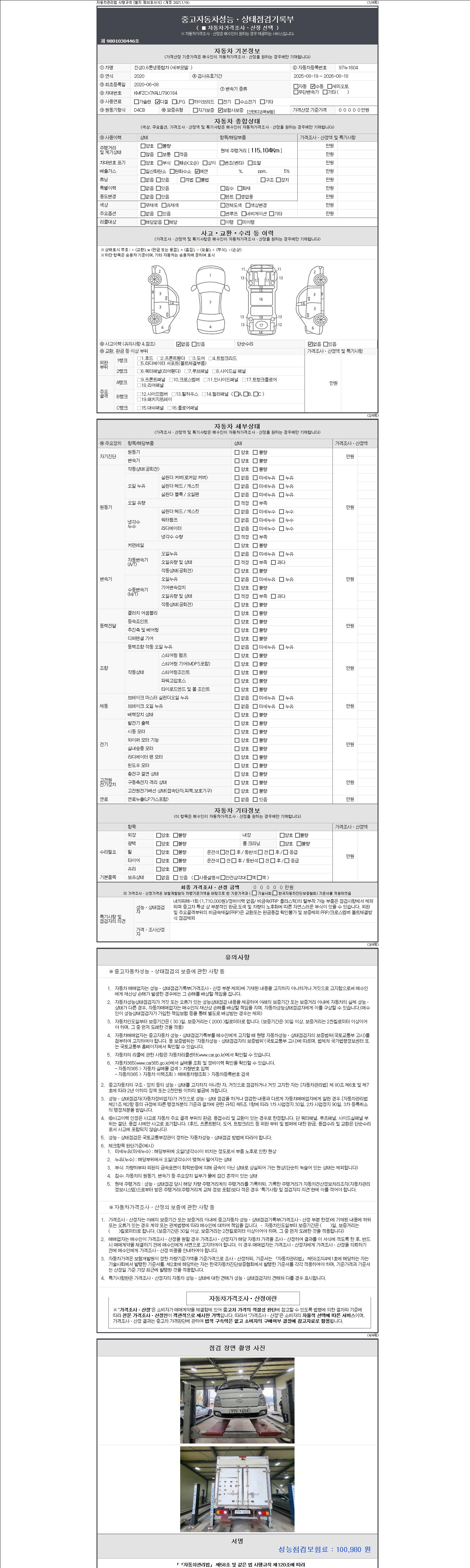 | 주행거리 | 115,104 km | 차량번호 | 97누1604 | 사고유무 | 성능기록부 참조 | 제시번호 | 제 2147483647 호 |