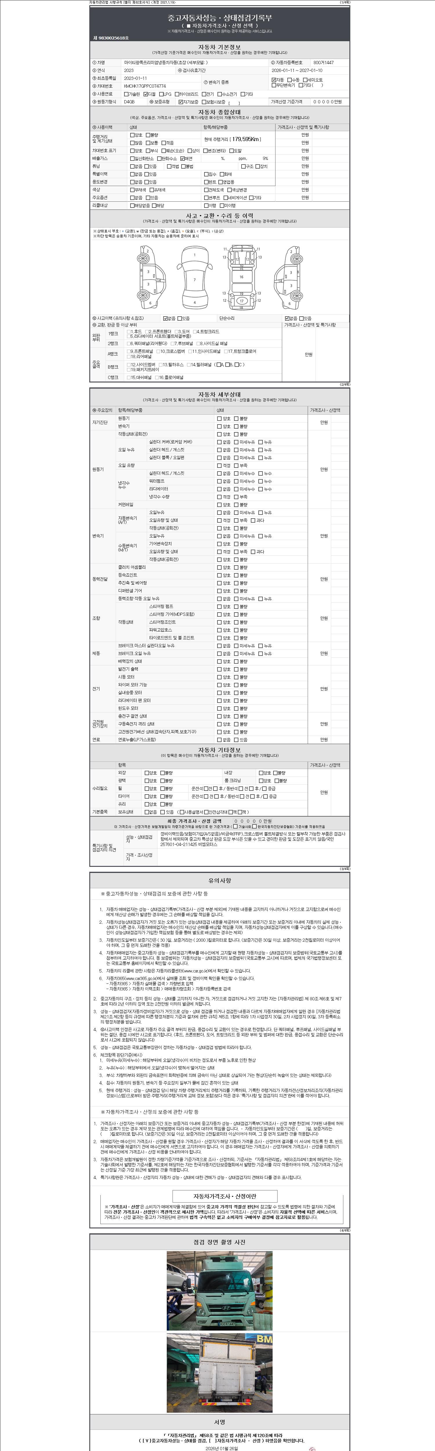 | 주행거리 | 179,595 km | 차량번호 | 800거1447 | 사고유무 | 성능기록부 참조 | 제시번호 | 제 2147483647 호 |