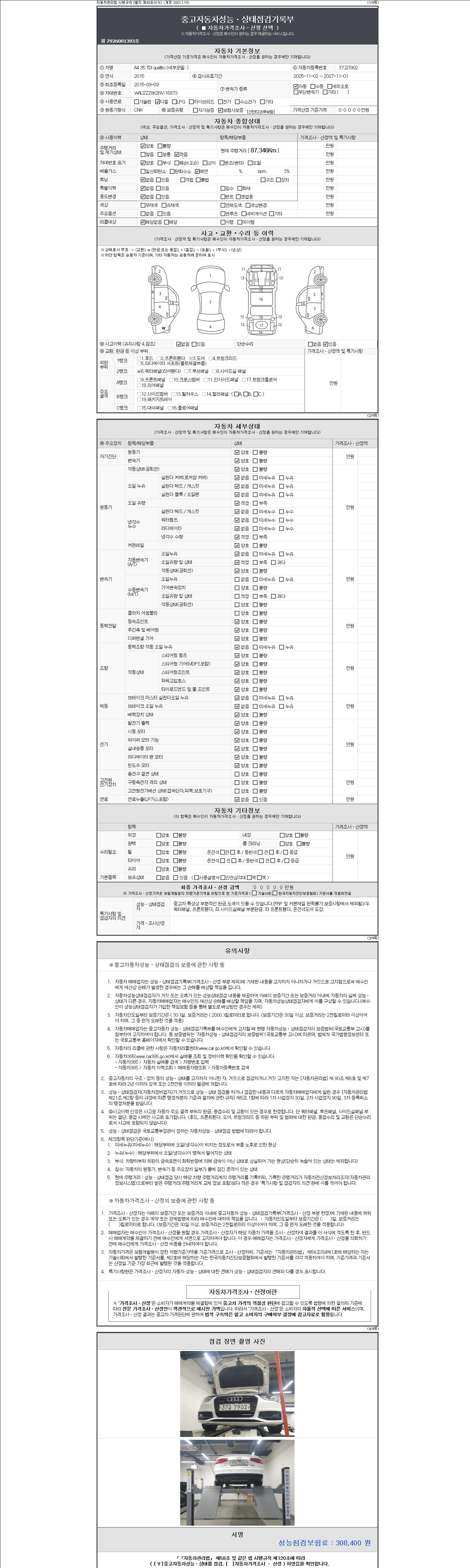 -중고자동차 매매업자를 통해 차량을 구입하실 경우 반드시 "중고자동차 성능, 상태점검 기록부"를 교뷰 받으셔야 하며, 매매업자는 반드시 의무 교부 하여야 압니다.