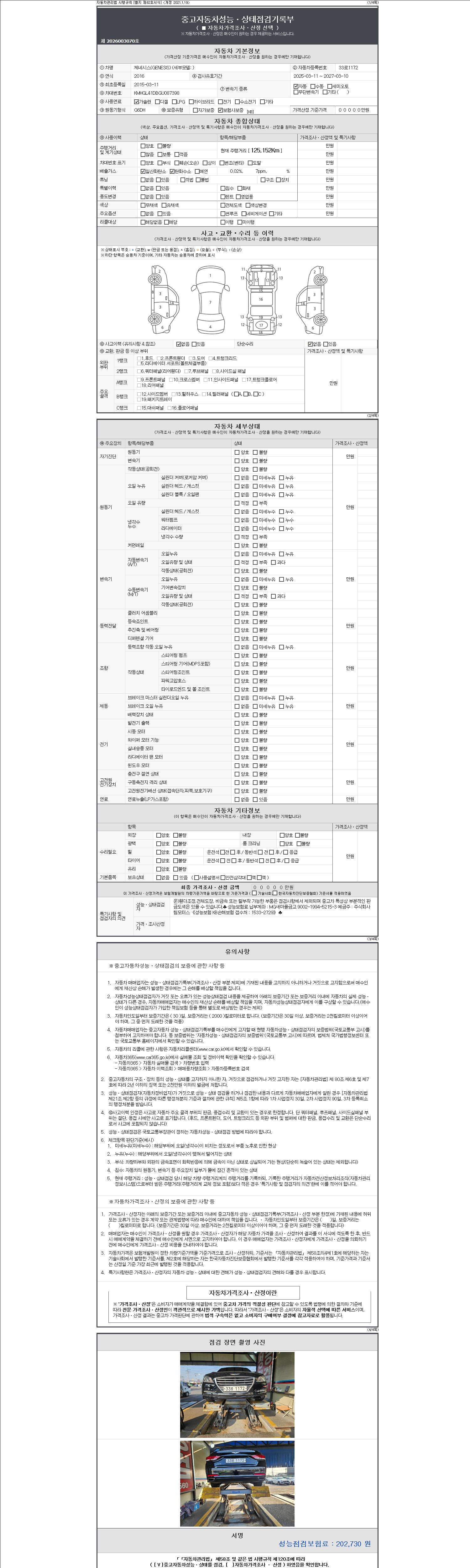 | 주행거리 | 125,152 km | 차량번호 | 33로1172 | 사고유무 | 성능기록부 참조 | 제시번호 | 제 2147483647 호 |