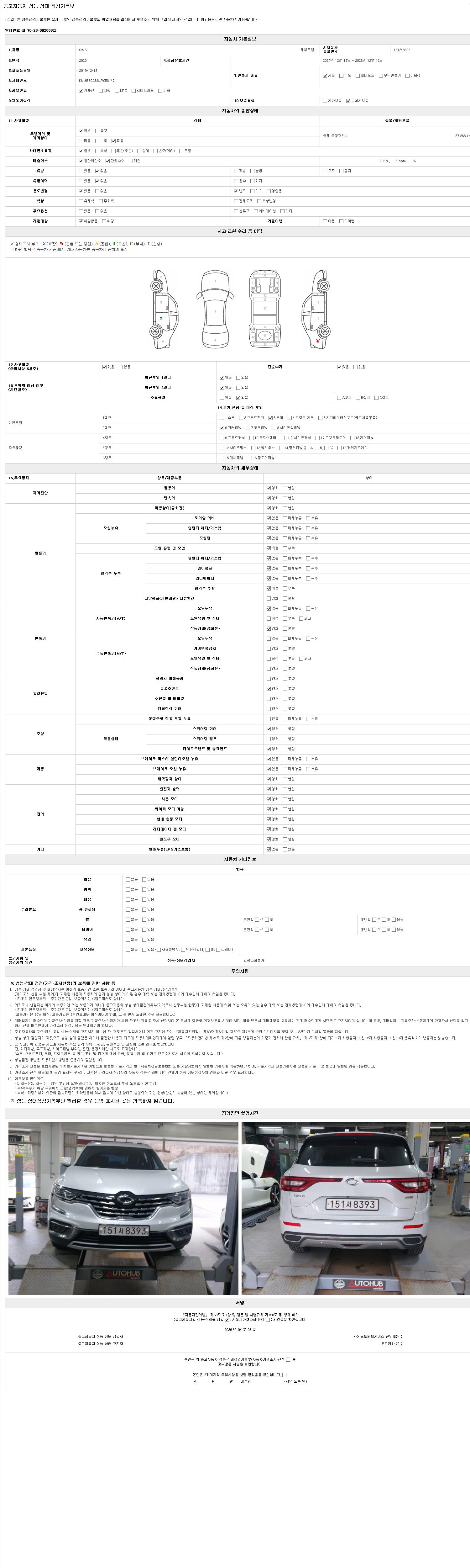 - 2. 차량 등록증이나 성능점검지 등을 상담자에게 요청및 확인하시고 사전에 미리 점검 하시기를 권유드립니다.