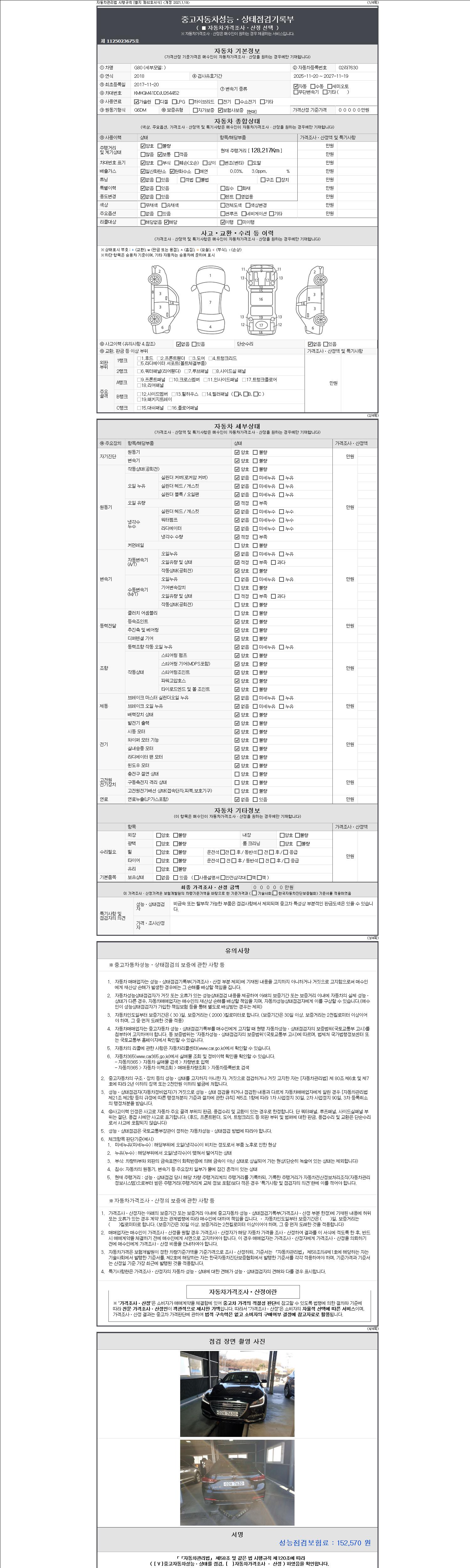 자동차관리법 시행규칙 제120조의 규정에 따라 별지 제 82호서식 《중고자동차 성능, 상태점검 기록부》를 발행한 성능, 상태점검자 및 매매자는 아래의 보증기간 또는 보증거리 이내의 중고자동차, 성능점검 기록부에 기재된 내용과 자동차의 실제 성능, 상태가 다른 경우 계약 또는 관계법령에 따라 매수인에 대하여 책임을 집니다.