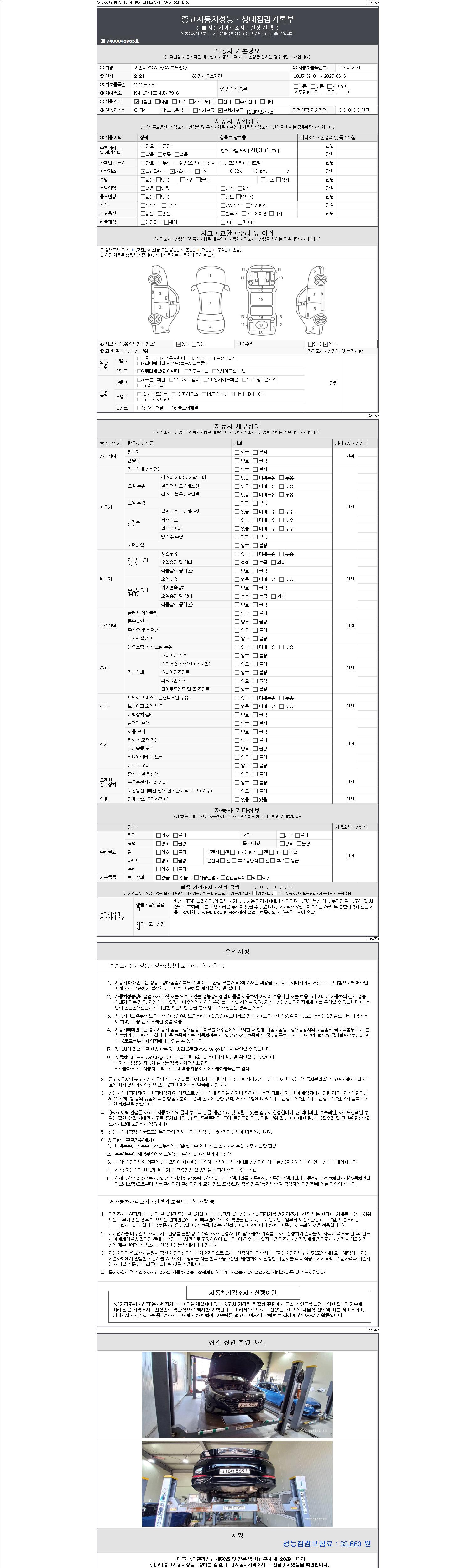 자동차관리법 시행규칙 제120조의 규정에 따라 별지 제 82호서식 《중고자동차 성능, 상태점검 기록부》를 발행한 성능, 상태점검자 및 매매자는 아래의 보증기간 또는 보증거리 이내의 중고자동차, 성능점검 기록부에 기재된 내용과 자동차의 실제 성능, 상태가 다른 경우 계약 또는 관계법령에 따라 매수인에 대하여 책임을 집니다.