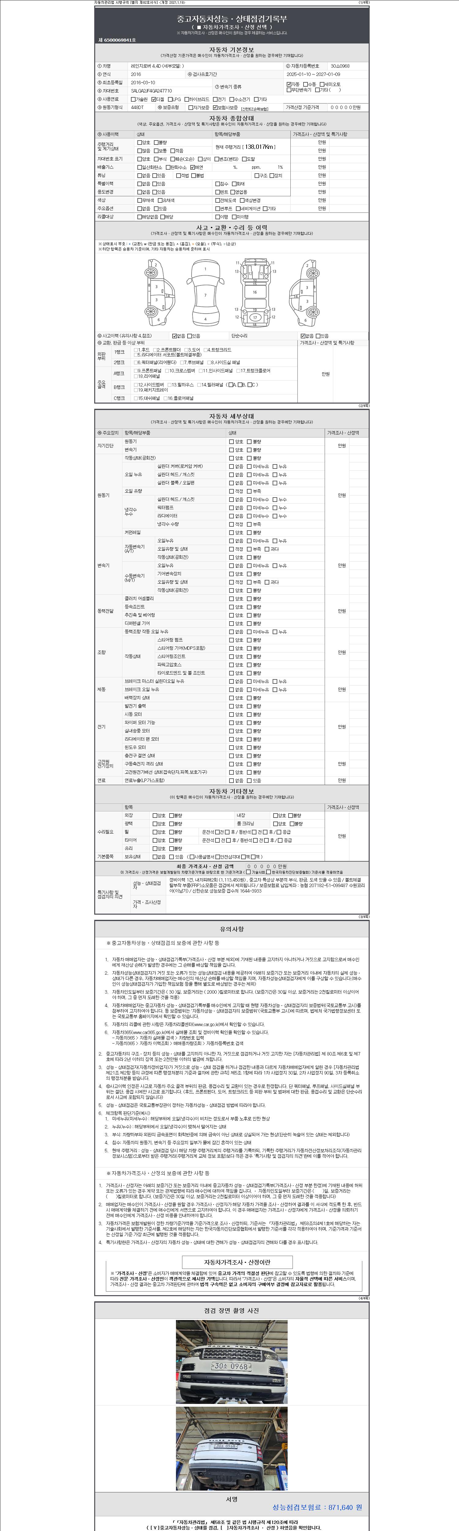 | 주행거리 | 138,017 km | 차량번호 | 30소0968 | 사고유무 | 성능기록부 참조 | 제시번호 | 제 2147483647 호 |