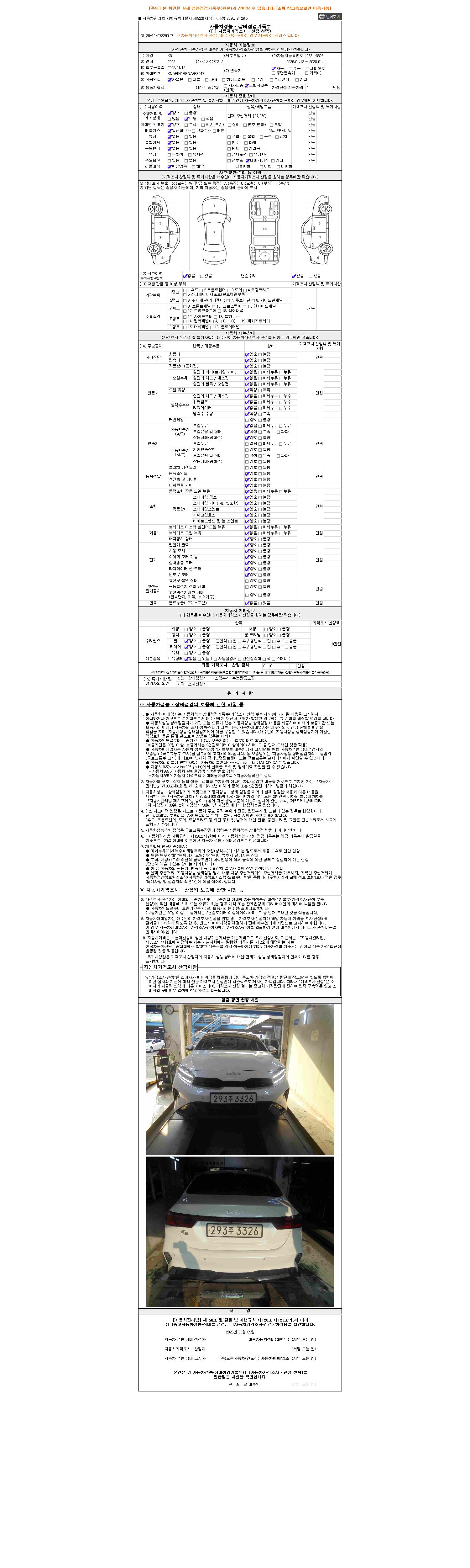 | 주행거리 | 67,665 km | 차량번호 | 293주3326 | 사고유무 | 성능기록부 참조 | 제시번호 | 제 2026028898 호 |