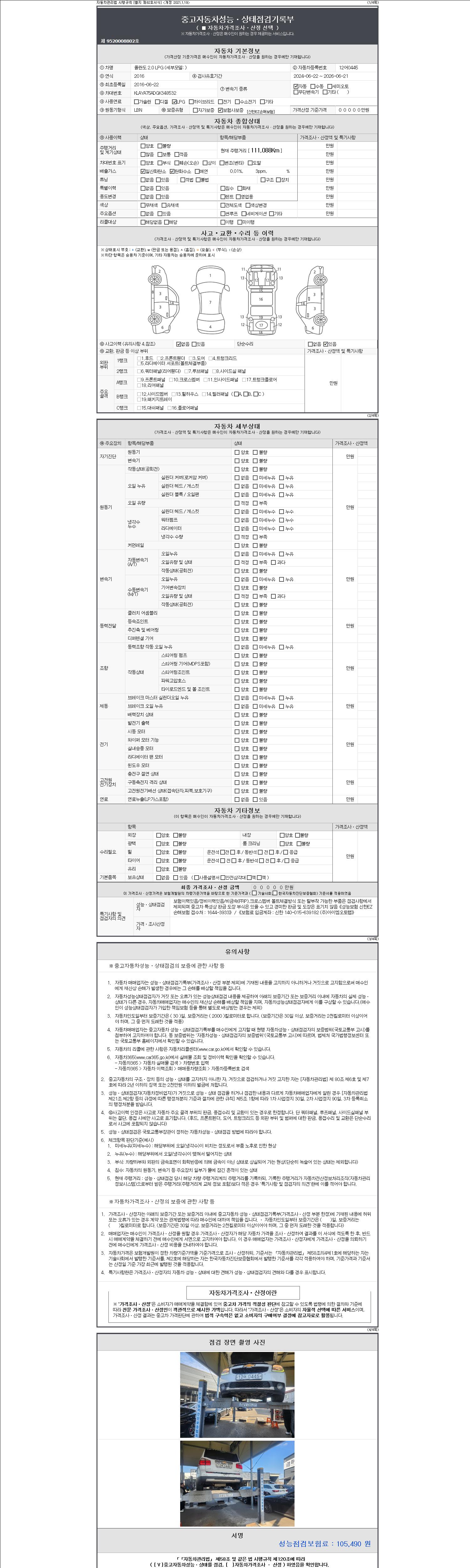 | 주행거리 | 111,088 km | 차량번호 | 12어0445 | 사고유무 | 성능기록부 참조 | 제시번호 | 제 2147483647 호 |