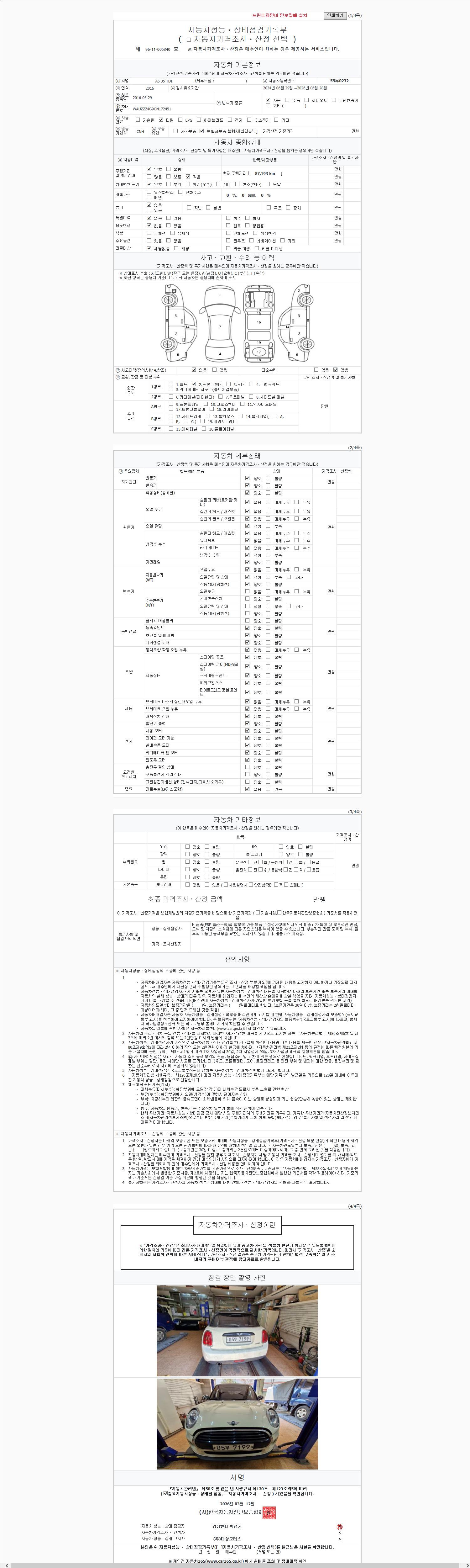 | 주행거리 | 87,193 km | 차량번호 | 55무0232 | 사고유무 | 성능기록부 참조 | 제시번호 | 제 2026031978 호 |