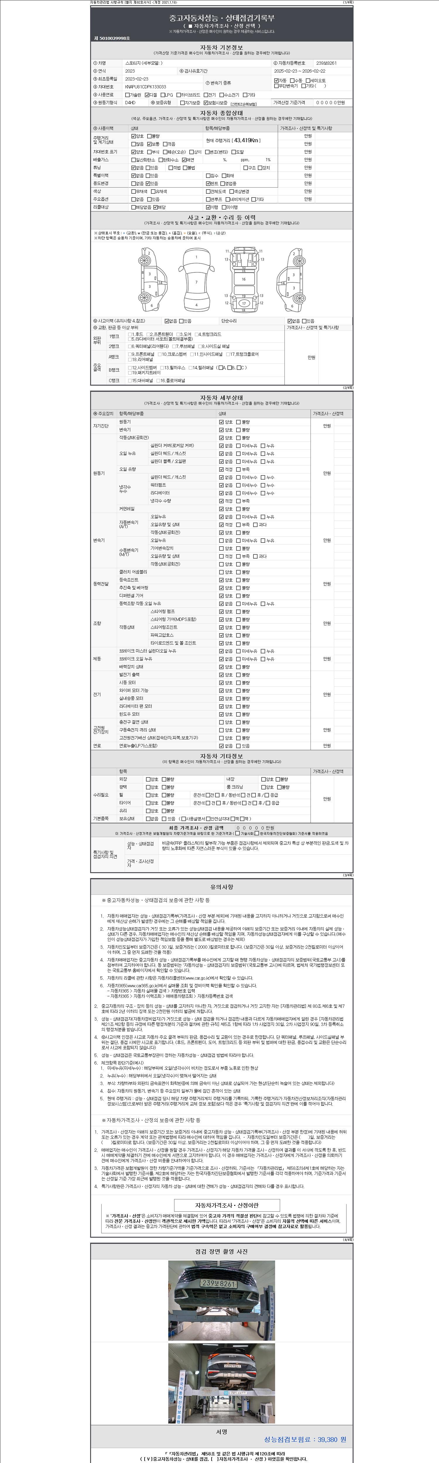 | 주행거리 | 43,419 km | 차량번호 | 239보8261 | 사고유무 | 성능기록부 참조 | 제시번호 | 제 2147483647 호 |