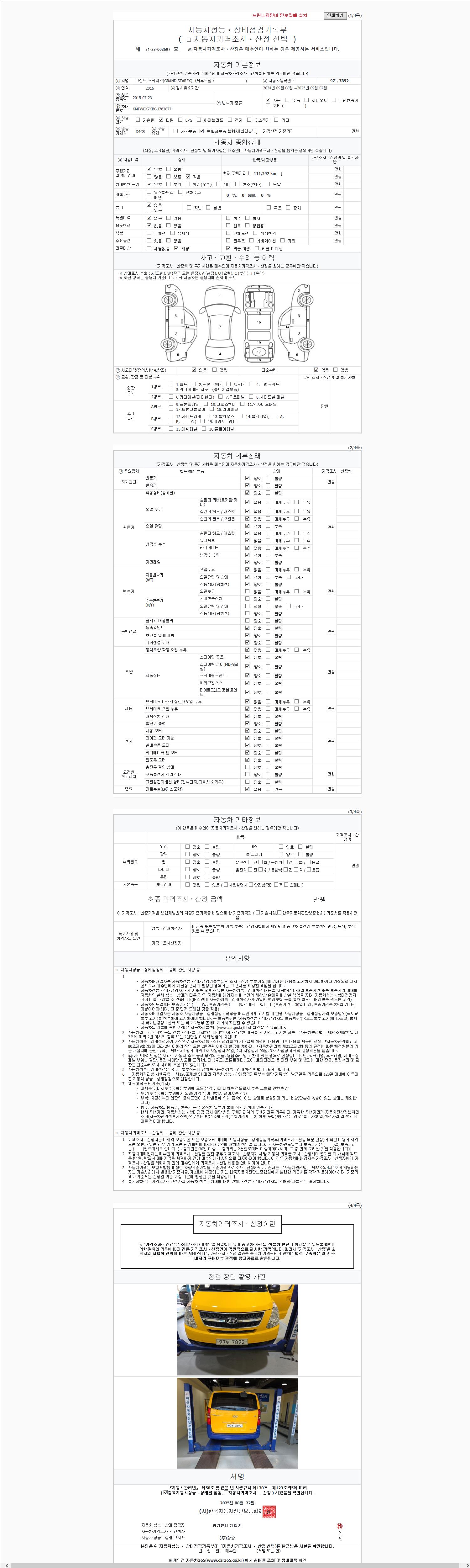 | 주행거리 | 111,292 km | 차량번호 | 97누7892 | 사고유무 | 성능기록부 참조 | 제시번호 | 제 2147483647 호 |