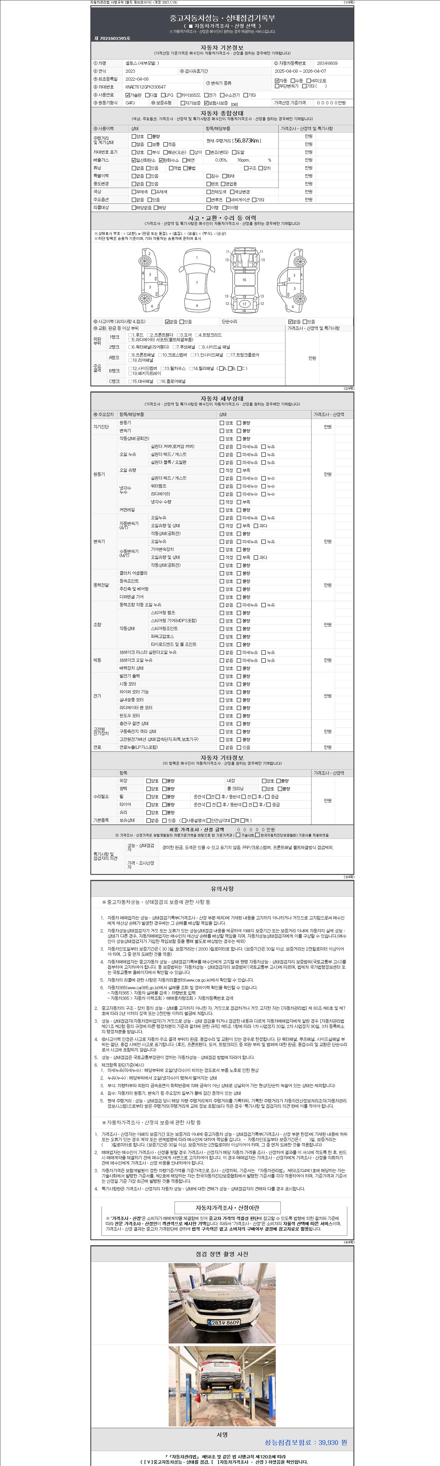 | 주행거리 | 56,861 km | 차량번호 | 283우8609 | 사고유무 | 성능기록부 참조 | 제시번호 | 제 2147483647 호 |