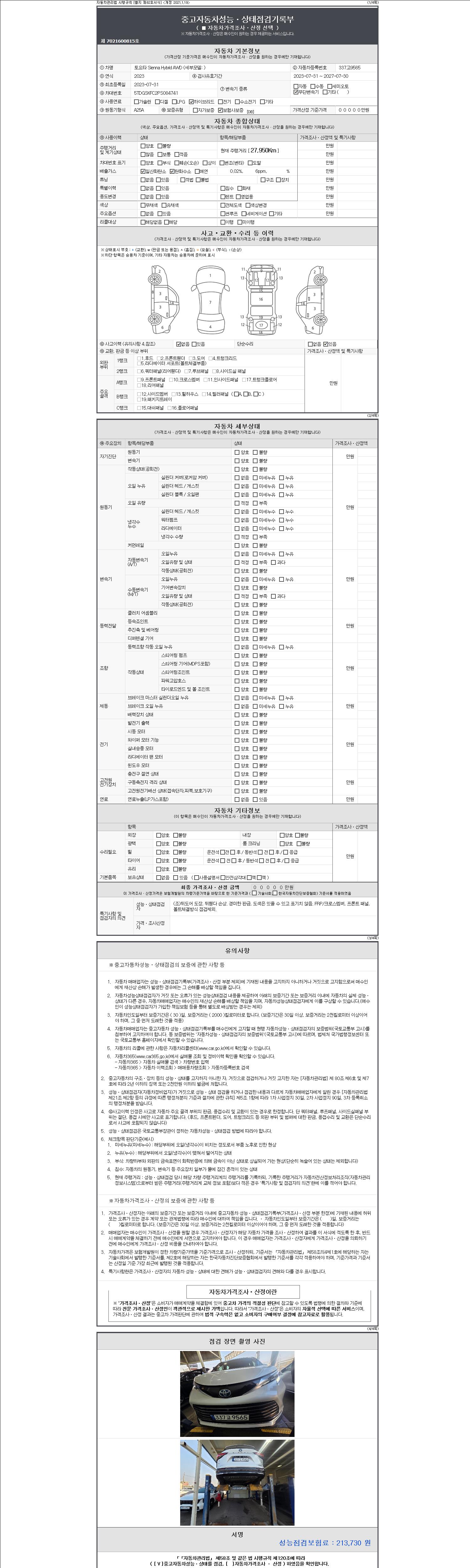 | 주행거리 | 27,950 km | 차량번호 | 337고9565 | 사고유무 | 성능기록부 참조 | 제시번호 | 제 2147483647 호 |
