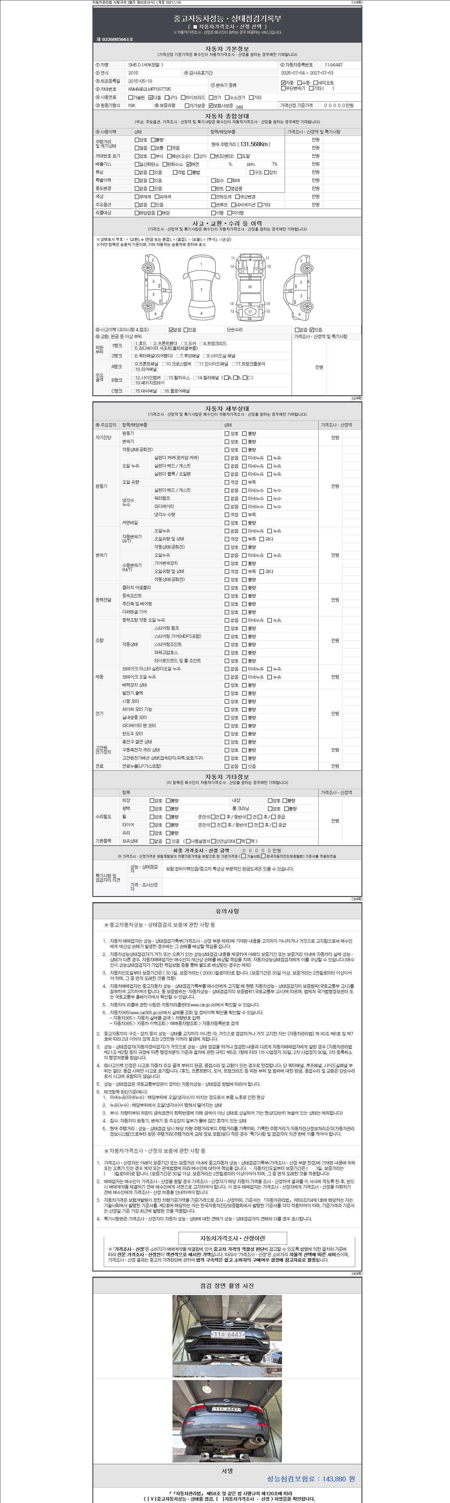 | 주행거리 | 131,568 km | 차량번호 | 11수6447 | 사고유무 | 성능기록부 참조 | 제시번호 | 제 2147483647 호 |