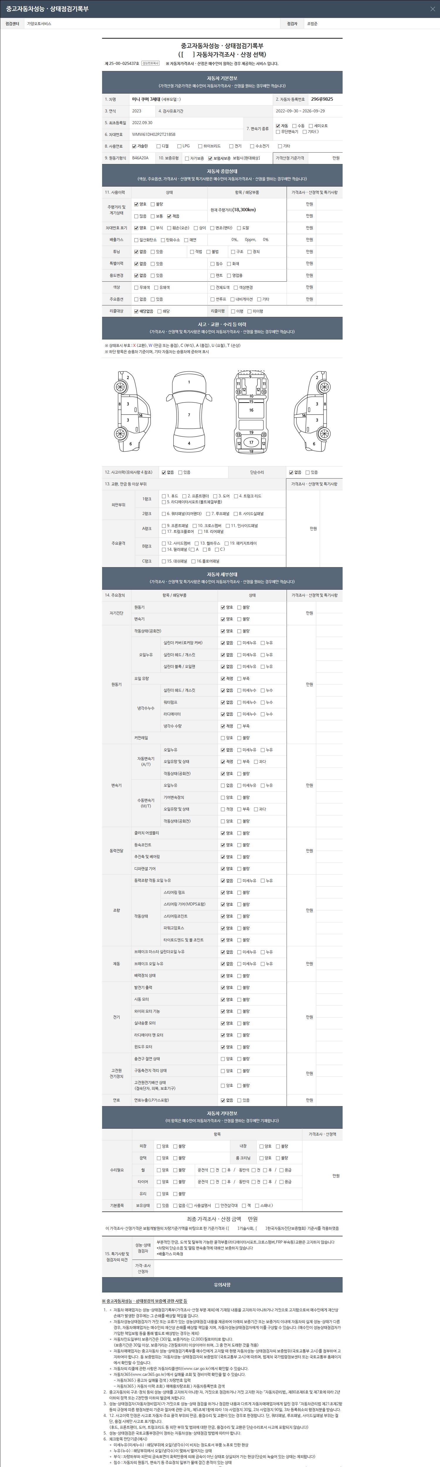 | 주행거리 | 18,300 km | 차량번호 | 296루9825 | 사고유무 | 성능기록부 참조 | 제시번호 | 제 2025038798 호 |