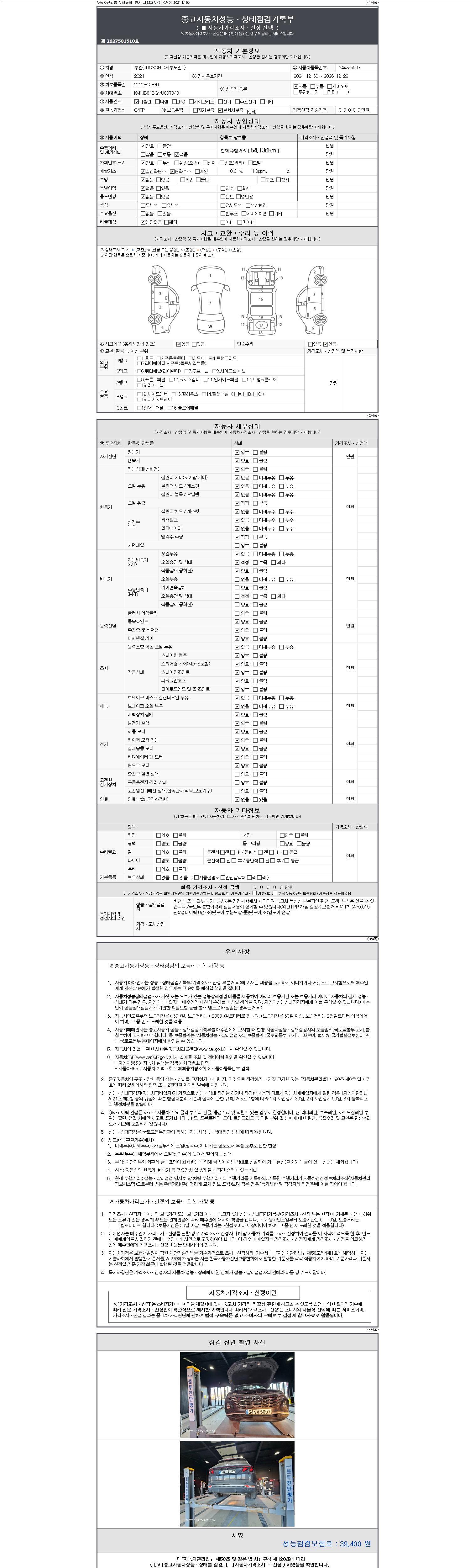 | 주행거리 | 54,136 km | 차량번호 | 344서5007 | 사고유무 | 성능기록부 참조 | 제시번호 | 제 2147483647 호 |