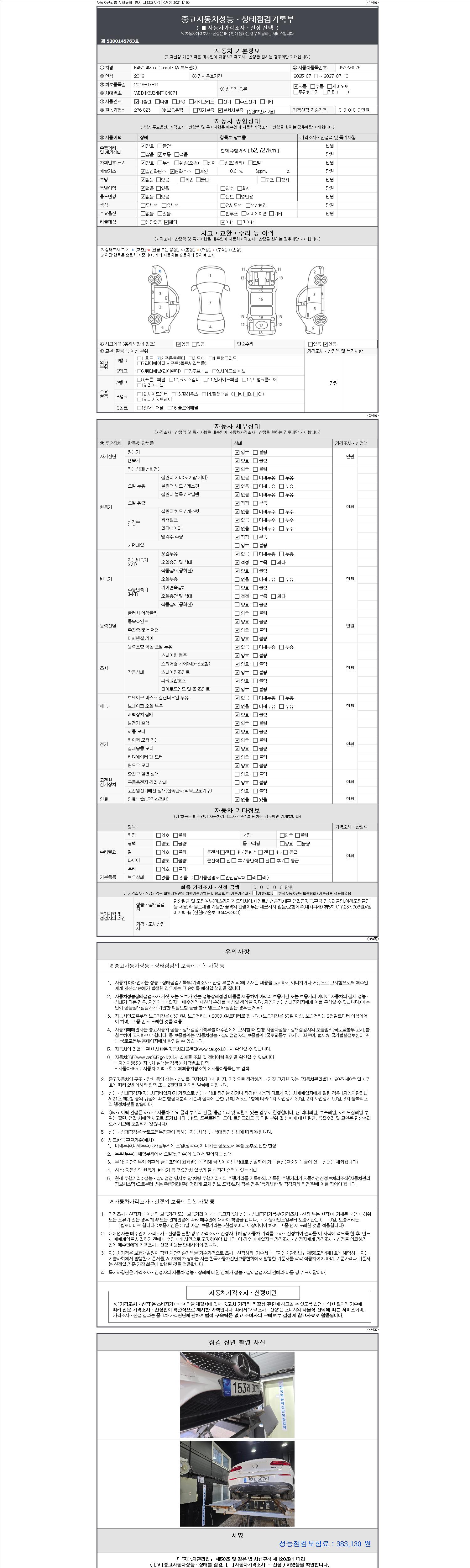 자동차관리법 시행규칙 제120조의 규정에 따라 별지 제 82호서식 《중고자동차 성능, 상태점검 기록부》를 발행한 성능, 상태점검자 및 매매자는 아래의 보증기간 또는 보증거리 이내의 중고자동차, 성능점검 기록부에 기재된 내용과 자동차의 실제 성능, 상태가 다른 경우 계약 또는 관계법령에 따라 매수인에 대하여 책임을 집니다.