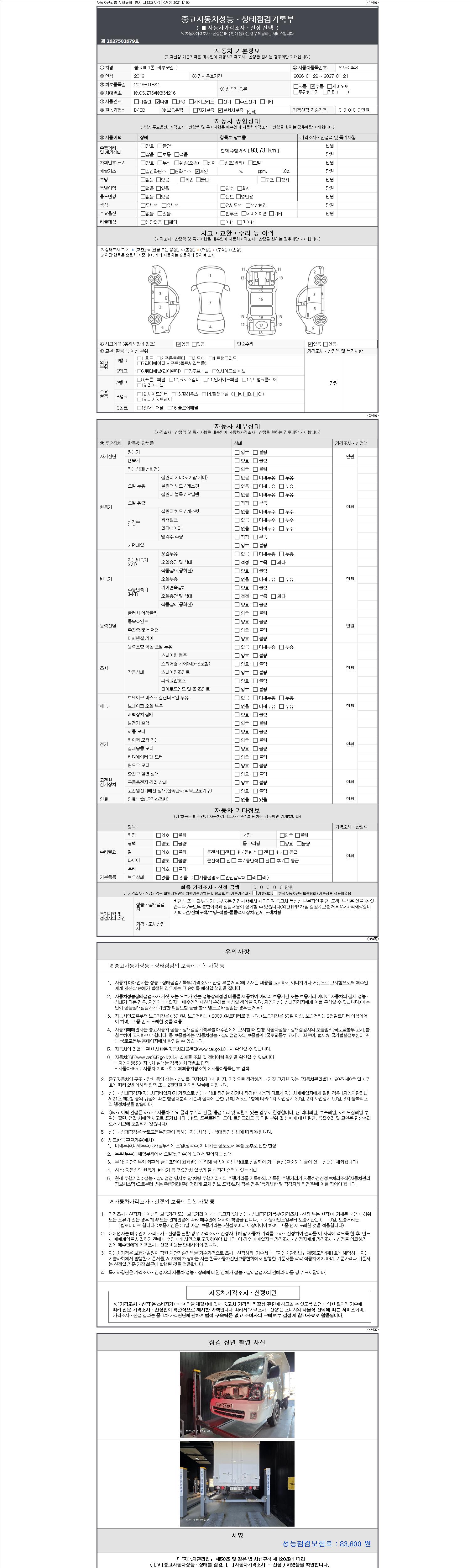 | 주행거리 | 93,606 km | 차량번호 | 82두2448 | 사고유무 | 성능기록부 참조 | 제시번호 | 제 2147483647 호 |