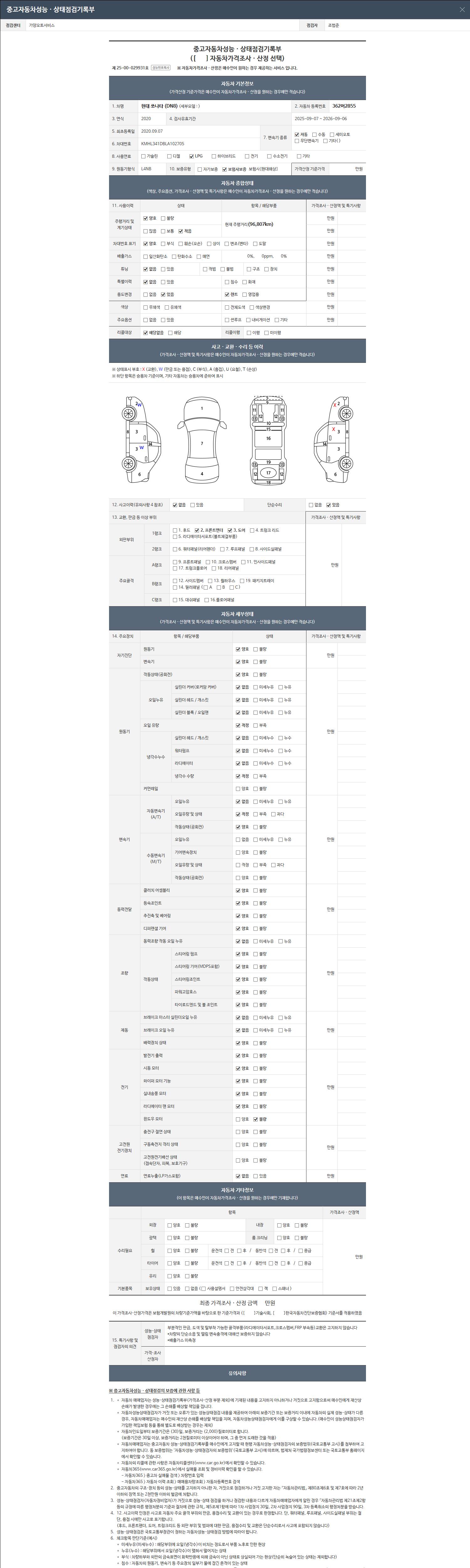 | 주행거리 | 96,807 km | 차량번호 | 362머2855 | 사고유무 | 성능기록부 참조 | 제시번호 | 제 2147483647 호 |