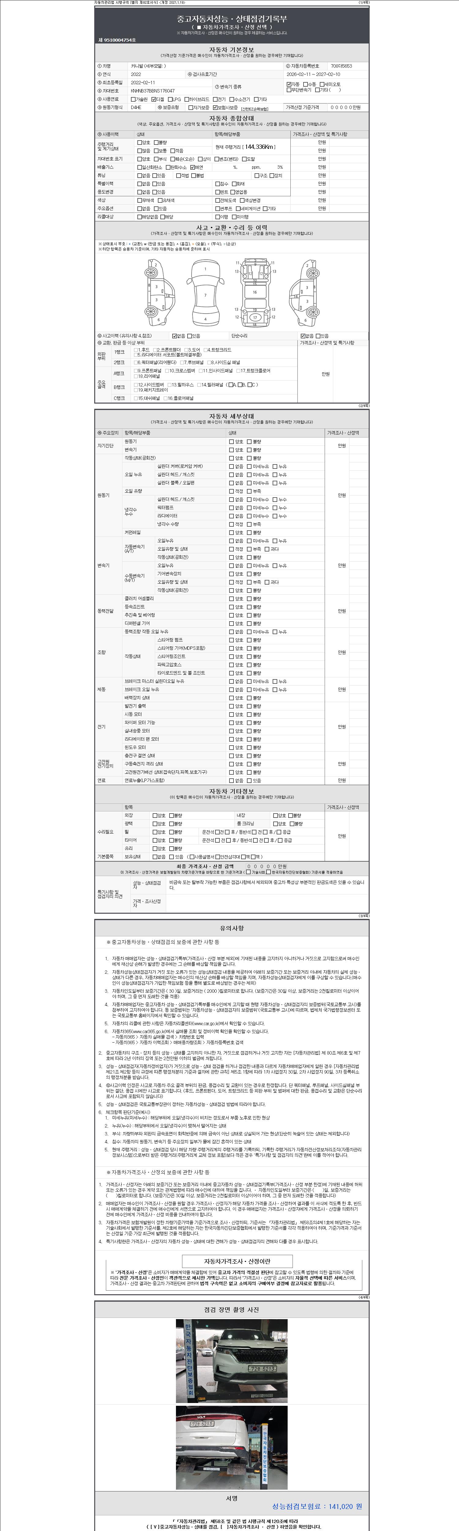 자동차관리법 시행규칙 제120조의 규정에 따라 별지 제 82호서식 《중고자동차 성능, 상태점검 기록부》를 발행한 성능, 상태점검자 및 매매자는 아래의 보증기간 또는 보증거리 이내의 중고자동차, 성능점검 기록부에 기재된 내용과 자동차의 실제 성능, 상태가 다른 경우 계약 또는 관계법령에 따라 매수인에 대하여 책임을 집니다.