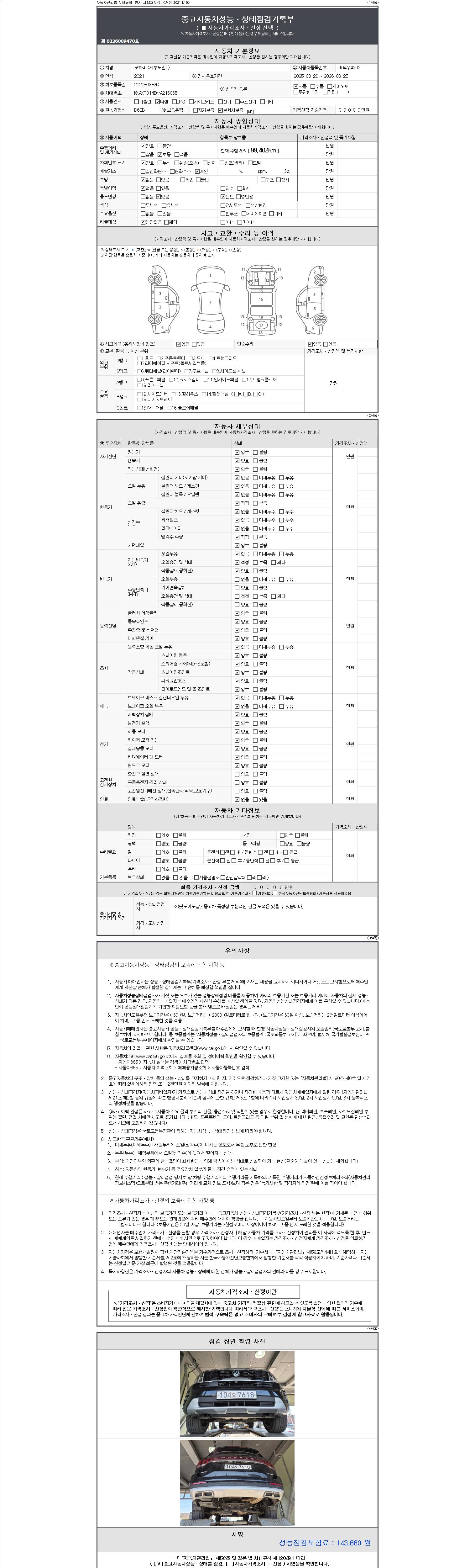 | 주행거리 | 99,402 km | 차량번호 | 104우4303 | 사고유무 | 성능기록부 참조 | 제시번호 | 제 2147483647 호 |