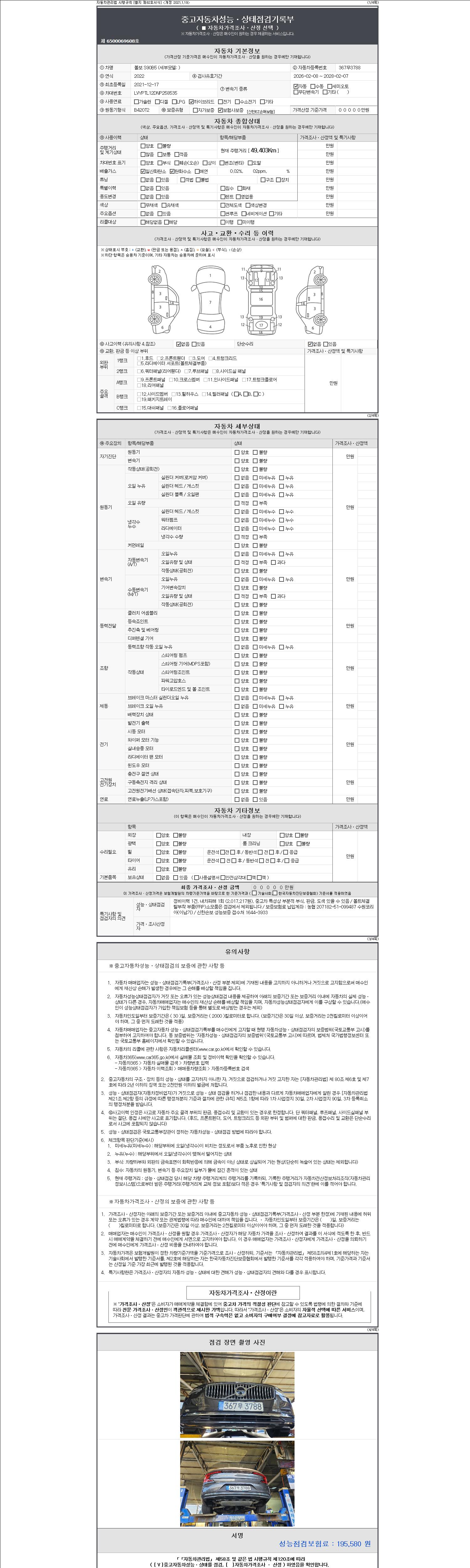 | 주행거리 | 49,403 km | 차량번호 | 367무3788 | 사고유무 | 성능기록부 참조 | 제시번호 | 제 2147483647 호 |