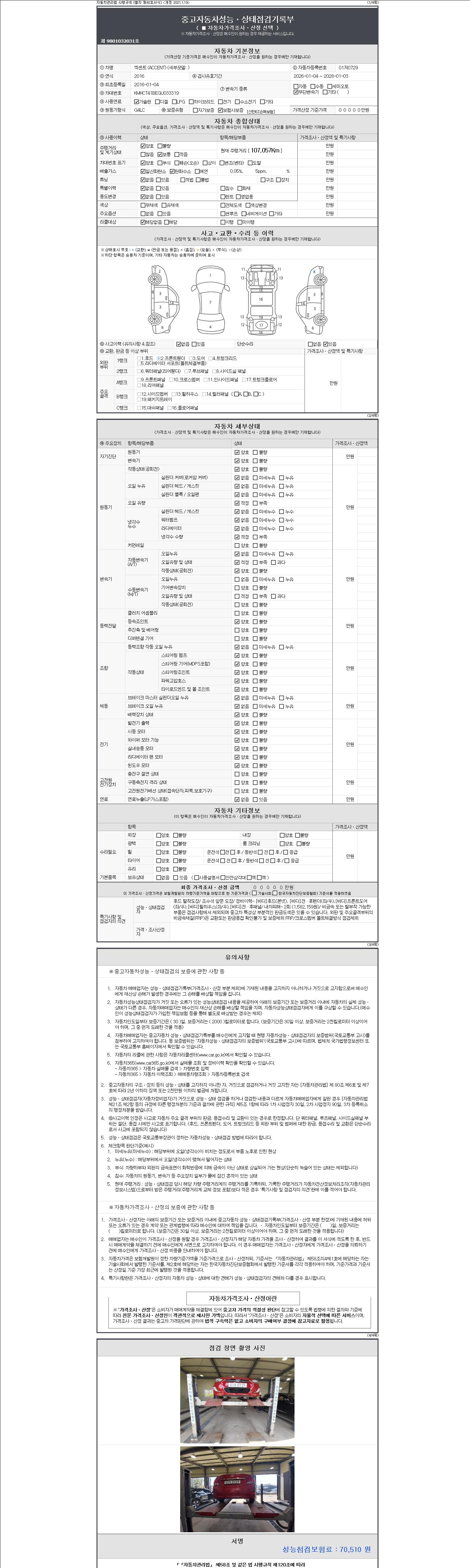 | 주행거리 | 107,057 km | 차량번호 | 01저0729 | 사고유무 | 성능기록부 참조 | 제시번호 | 제 2147483647 호 |