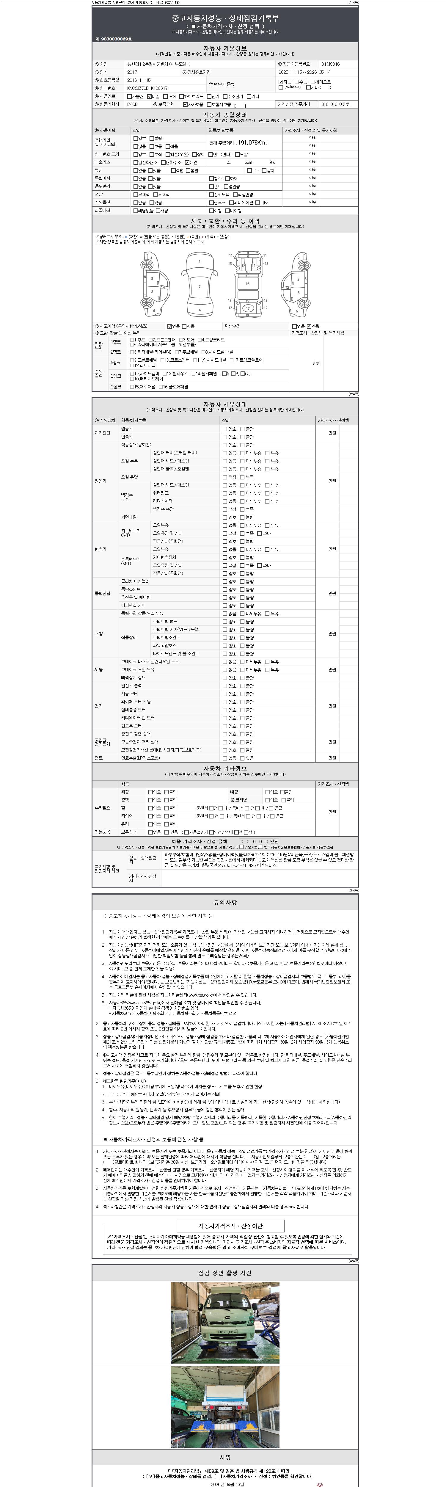 자동차관리법 시행규칙 제120조의 규정에 따라 별지 제 82호서식 《중고자동차 성능, 상태점검 기록부》를 발행한 성능, 상태점검자 및 매매자는 아래의 보증기간 또는 보증거리 이내의 중고자동차, 성능점검 기록부에 기재된 내용과 자동차의 실제 성능, 상태가 다른 경우 계약 또는 관계법령에 따라 매수인에 대하여 책임을 집니다.