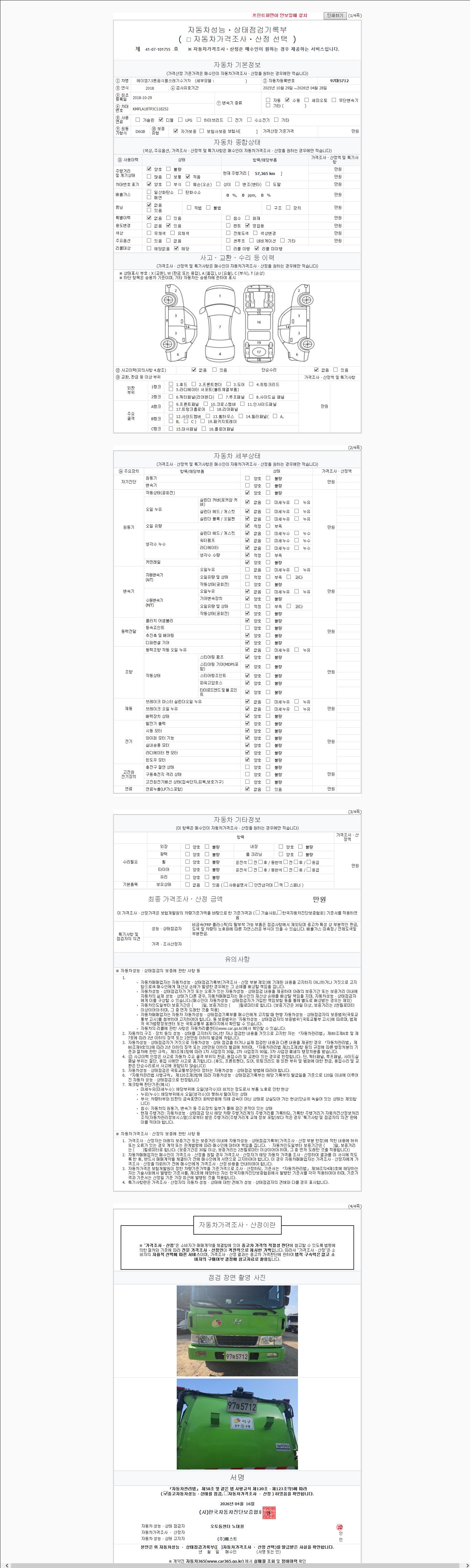 | 주행거리 | 57,365 km | 차량번호 | 97마5712 | 사고유무 | 성능기록부 참조 | 제시번호 | 제 2147483647 호 |