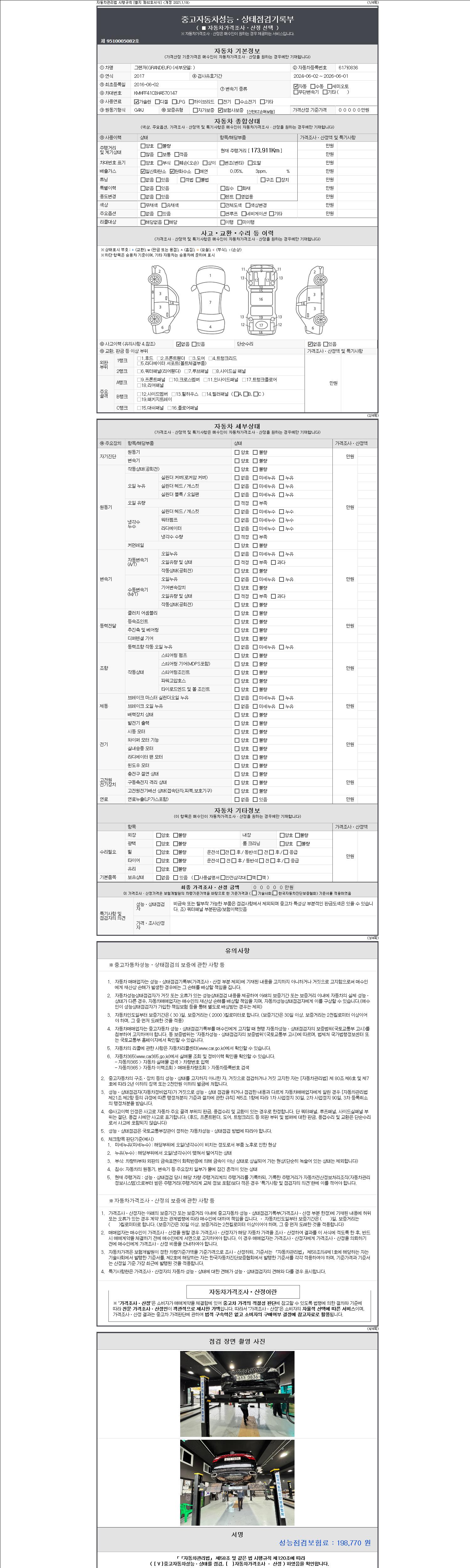 | 주행거리 | 173,911 km | 차량번호 | 61가0836 | 사고유무 | 성능기록부 참조 | 제시번호 | 제 2147483647 호 |