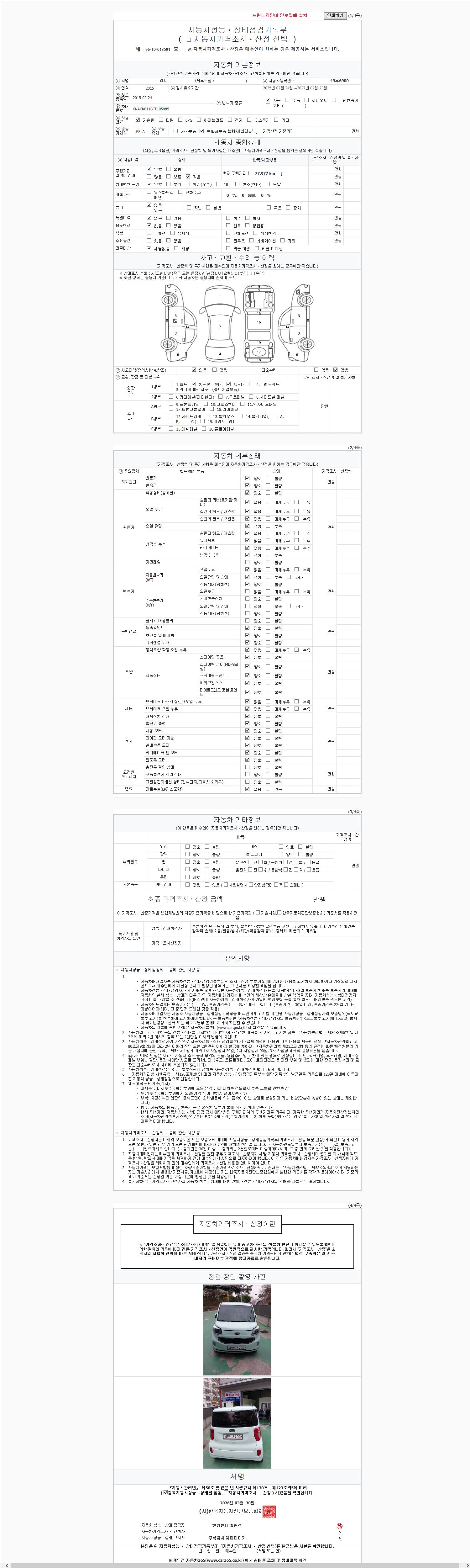 -중고자동차 매매업자를 통해 차량을 구입하실 경우 반드시 "중고자동차 성능, 상태점검 기록부"를 교뷰 받으셔야 하며, 매매업자는 반드시 의무 교부 하여야 압니다.