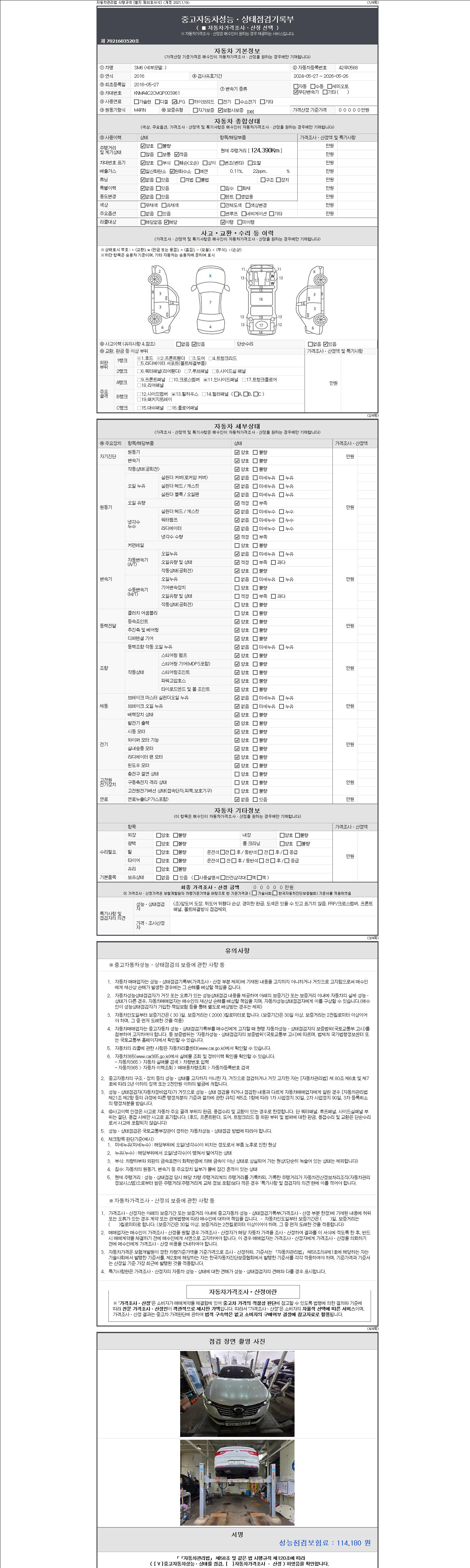 | 주행거리 | 124,390 km | 차량번호 | 42무0566 | 사고유무 | 성능기록부 참조 | 제시번호 | 제 2147483647 호 |