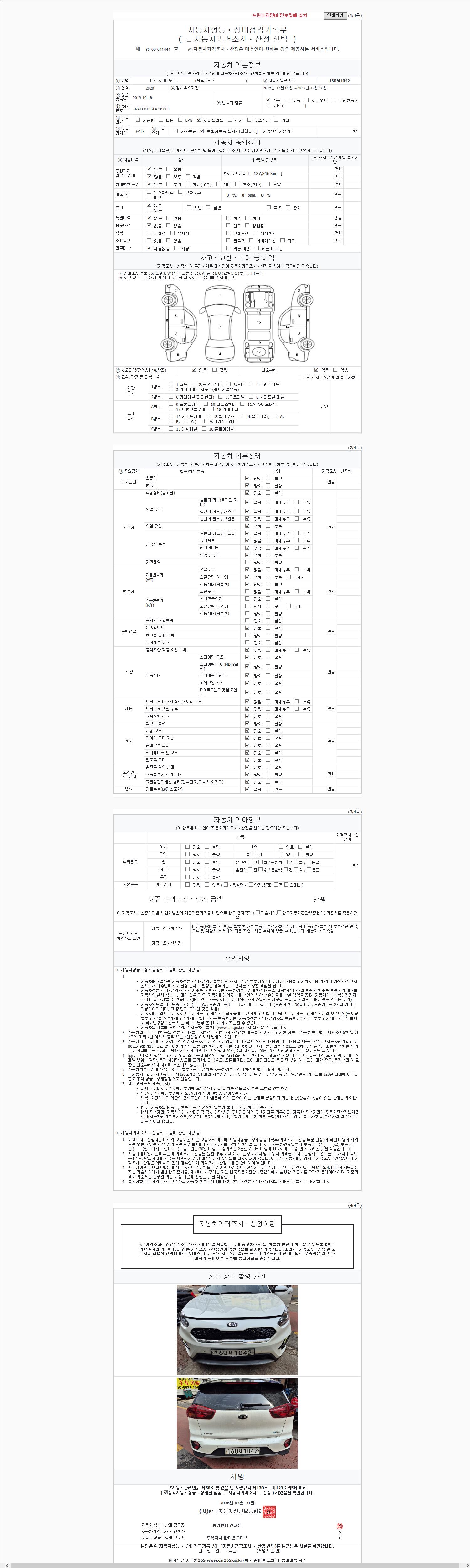 | 주행거리 | 137,846 km | 차량번호 | 160서1042 | 사고유무 | 성능기록부 참조 | 제시번호 | 제 2147483647 호 |