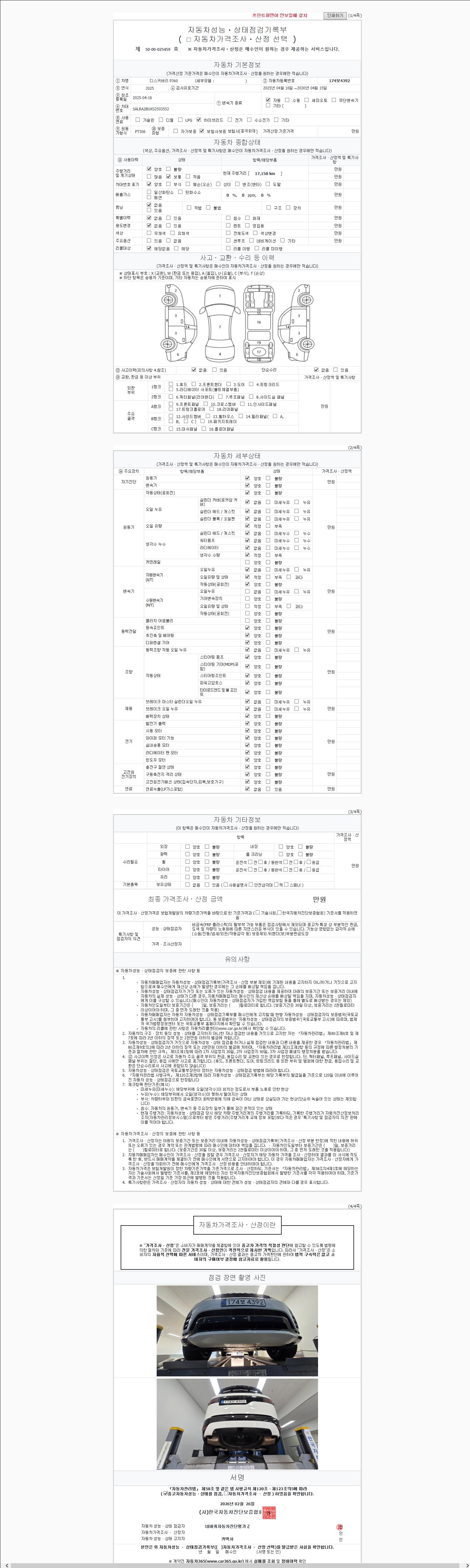 | 주행거리 | 17,158 km | 차량번호 | 174보4392 | 사고유무 | 성능기록부 참조 | 제시번호 | 제 2147483647 호 |