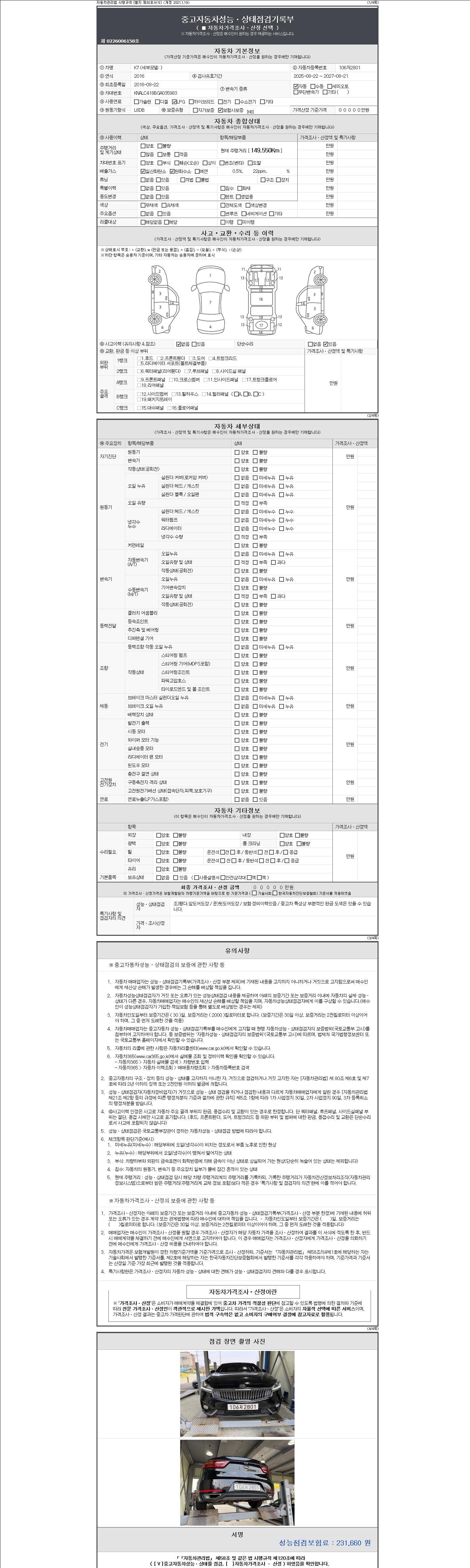 | 주행거리 | 149,550 km | 차량번호 | 106저2801 | 사고유무 | 성능기록부 참조 | 제시번호 | 제 2147483647 호 |