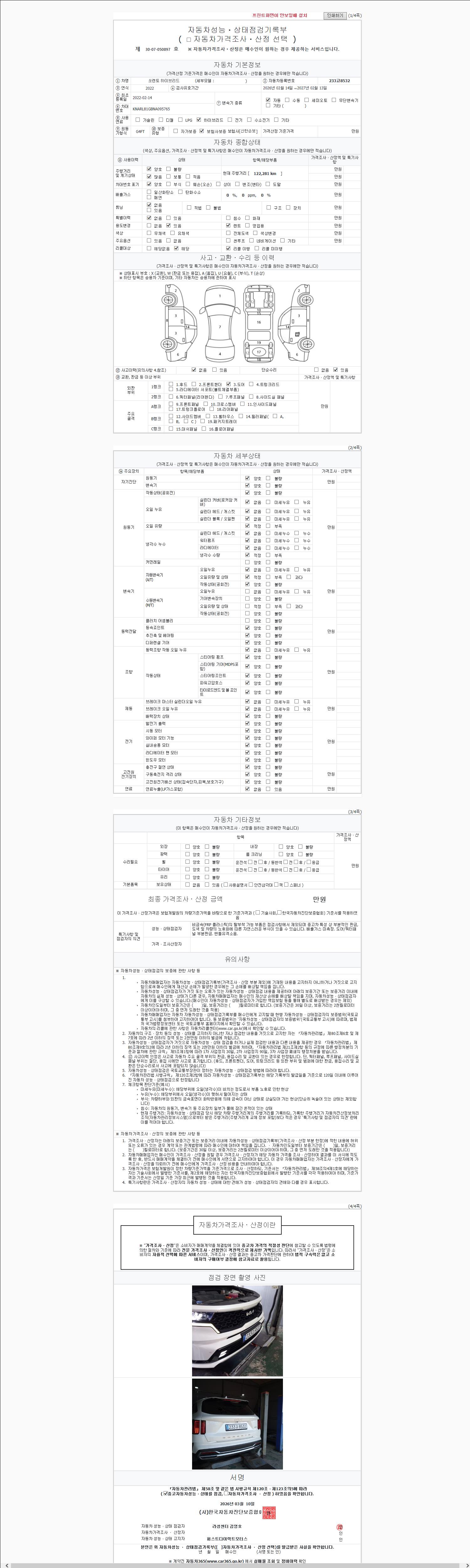 | 주행거리 | 122,281 km | 차량번호 | 233고8532 | 사고유무 | 성능기록부 참조 | 제시번호 | 제 2147483647 호 |