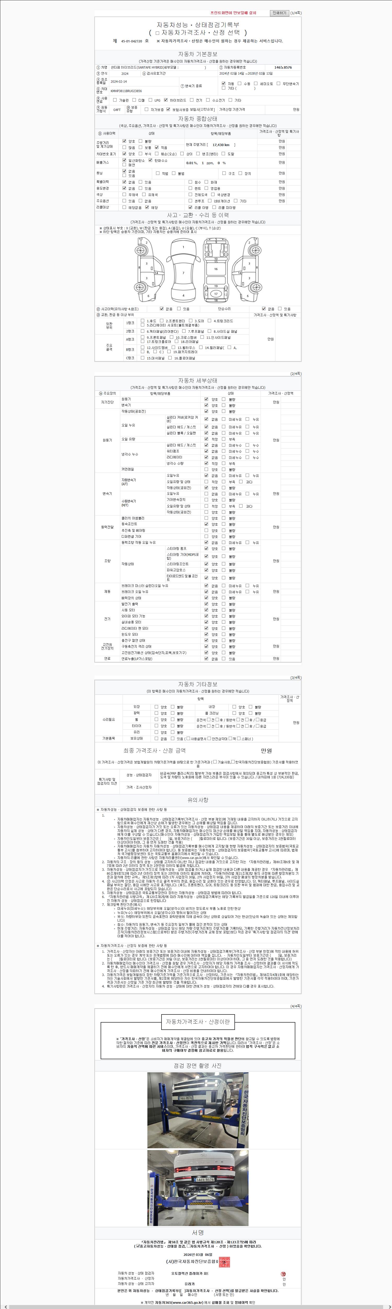 자동차관리법 시행규칙 제120조의 규정에 따라 별지 제 82호서식 《중고자동차 성능, 상태점검 기록부》를 발행한 성능, 상태점검자 및 매매자는 아래의 보증기간 또는 보증거리 이내의 중고자동차, 성능점검 기록부에 기재된 내용과 자동차의 실제 성능, 상태가 다른 경우 계약 또는 관계법령에 따라 매수인에 대하여 책임을 집니다.