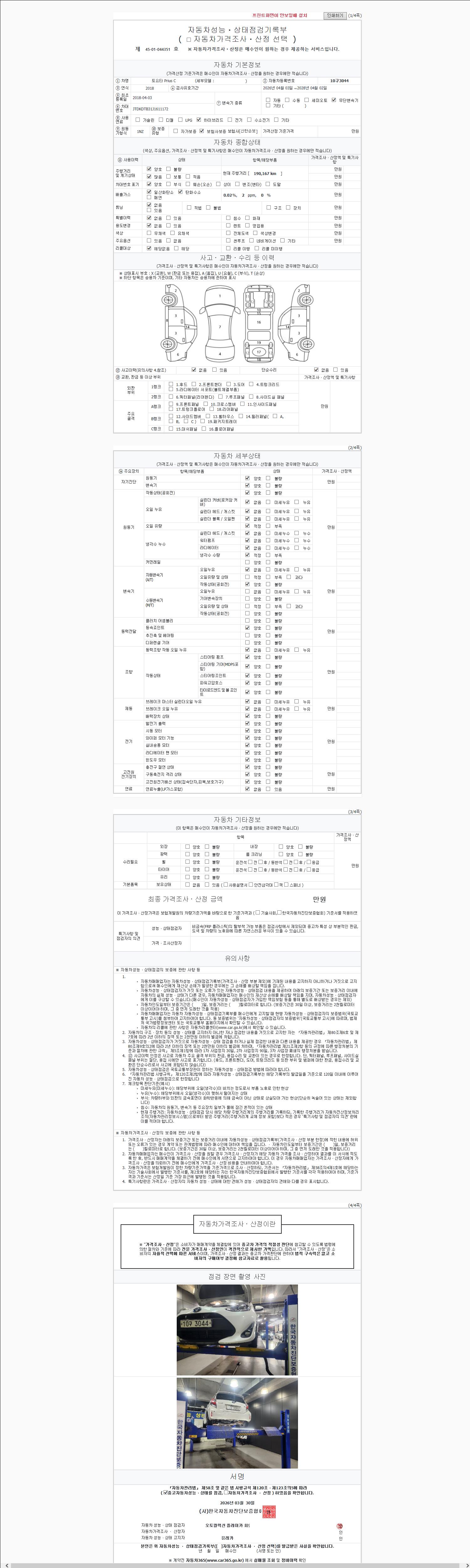| 주행거리 | 190,167 km | 차량번호 | 10구3044 | 사고유무 | 성능기록부 참조 | 제시번호 | 제 2147483647 호 |