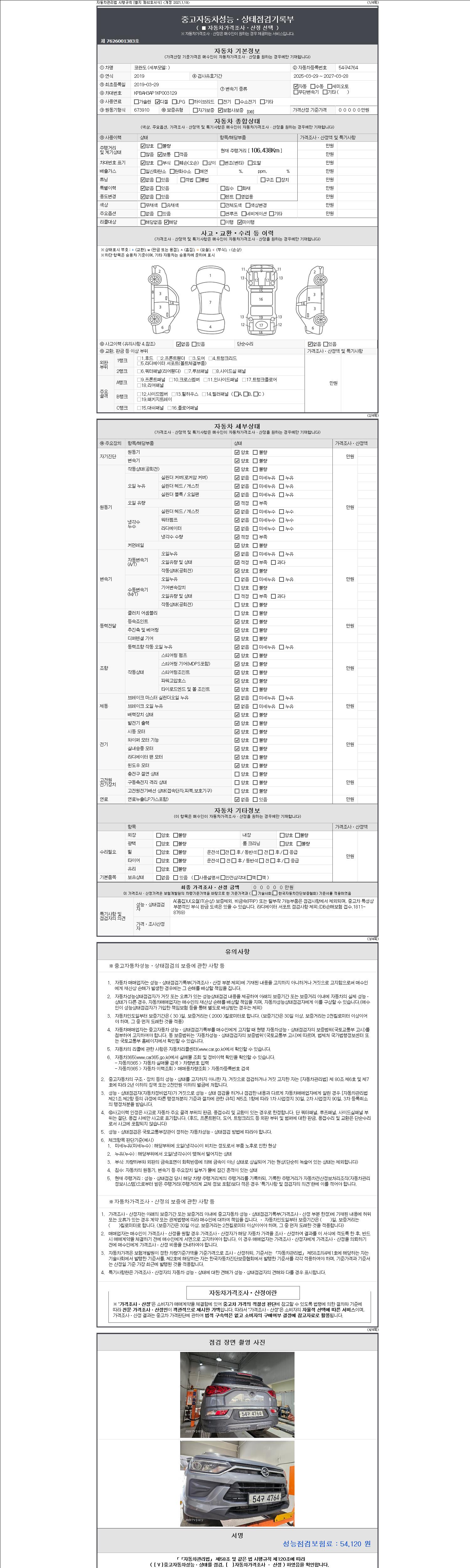 | 주행거리 | 106,438 km | 차량번호 | 54구4764 | 사고유무 | 성능기록부 참조 | 제시번호 | 제 2147483647 호 |