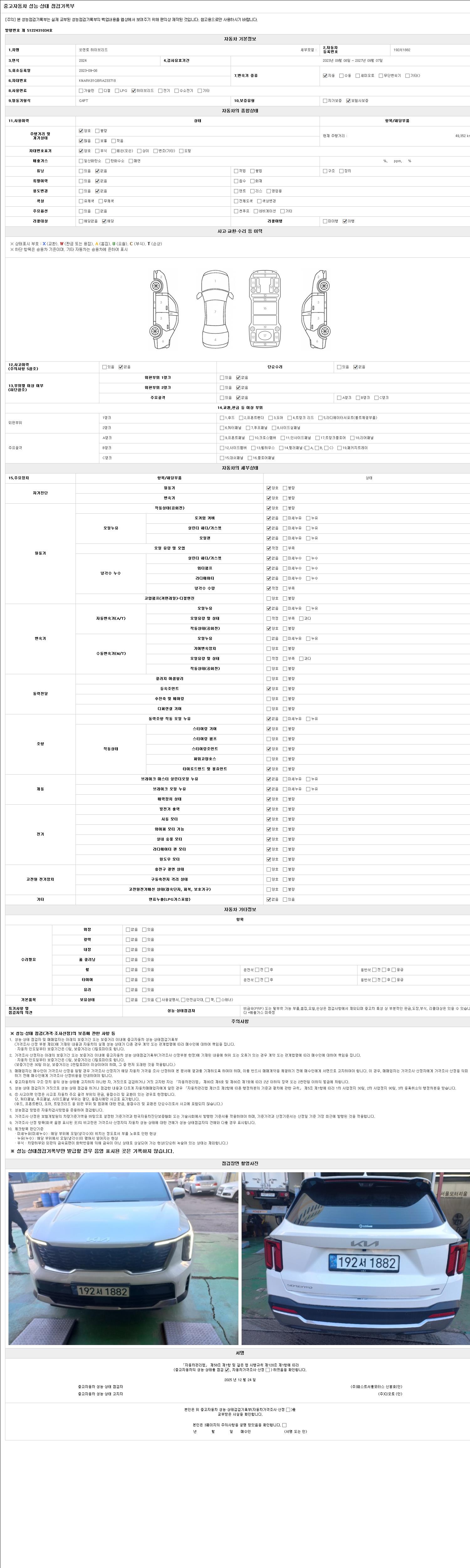 | 주행거리 | 49,000 km | 차량번호 | 192서1882 | 사고유무 | 성능기록부 참조 | 제시번호 | 제 2025042758 호 |