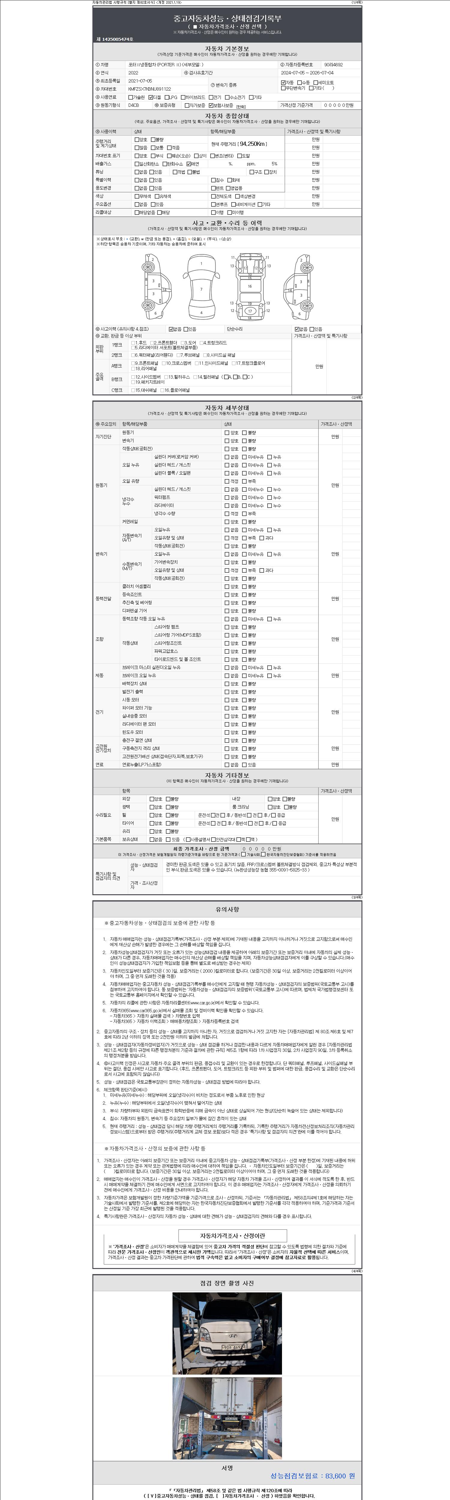 자동차관리법 시행규칙 제120조의 규정에 따라 별지 제 82호서식 《중고자동차 성능, 상태점검 기록부》를 발행한 성능, 상태점검자 및 매매자는 아래의 보증기간 또는 보증거리 이내의 중고자동차, 성능점검 기록부에 기재된 내용과 자동차의 실제 성능, 상태가 다른 경우 계약 또는 관계법령에 따라 매수인에 대하여 책임을 집니다.