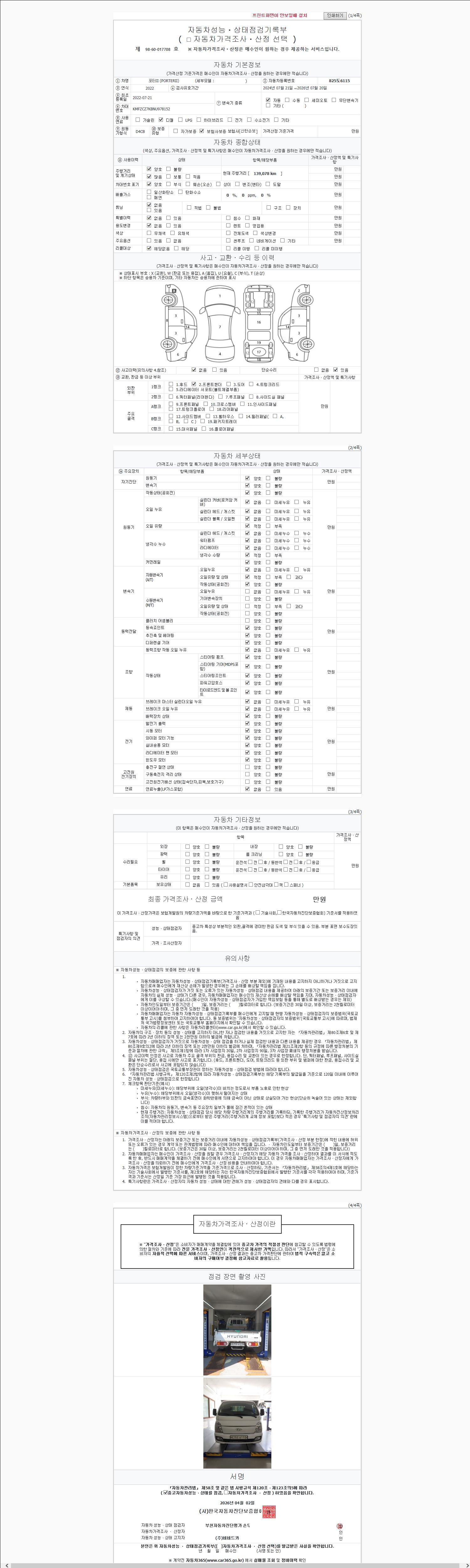 자동차관리법 시행규칙 제120조의 규정에 따라 별지 제 82호서식 《중고자동차 성능, 상태점검 기록부》를 발행한 성능, 상태점검자 및 매매자는 아래의 보증기간 또는 보증거리 이내의 중고자동차, 성능점검 기록부에 기재된 내용과 자동차의 실제 성능, 상태가 다른 경우 계약 또는 관계법령에 따라 매수인에 대하여 책임을 집니다.