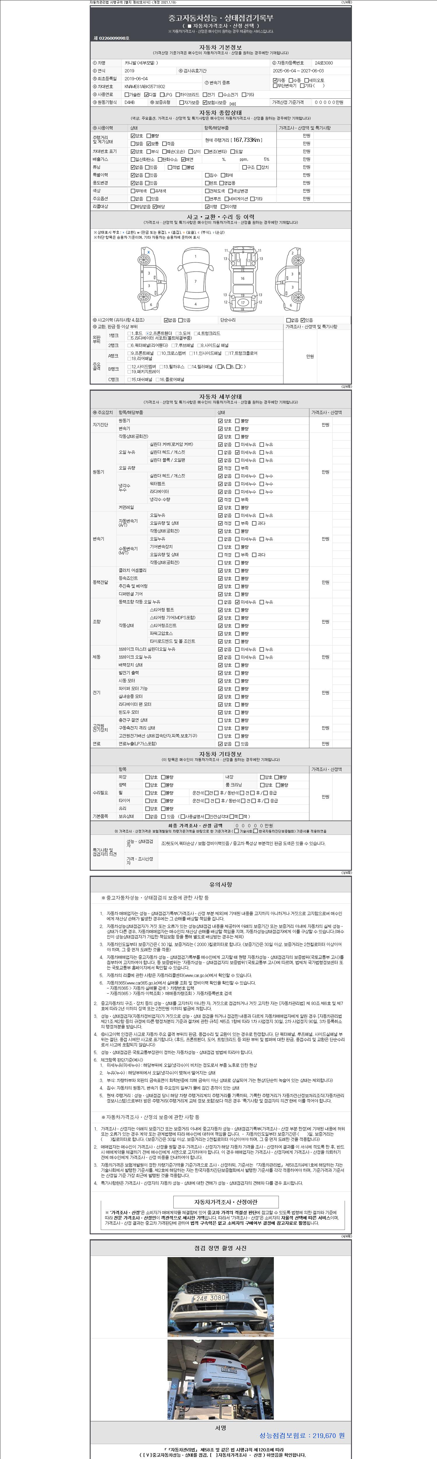 | 주행거리 | 167,733 km | 차량번호 | 24로3080 | 사고유무 | 성능기록부 참조 | 제시번호 | 제 2147483647 호 |