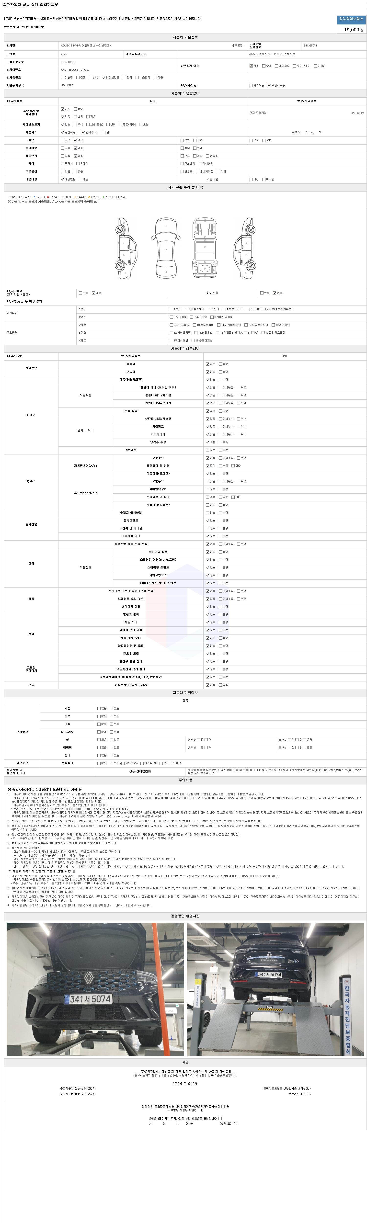 | 주행거리 | 24,730 km | 차량번호 | 341서5074 | 사고유무 | 성능기록부 참조 | 제시번호 | 제 2147483647 호 |