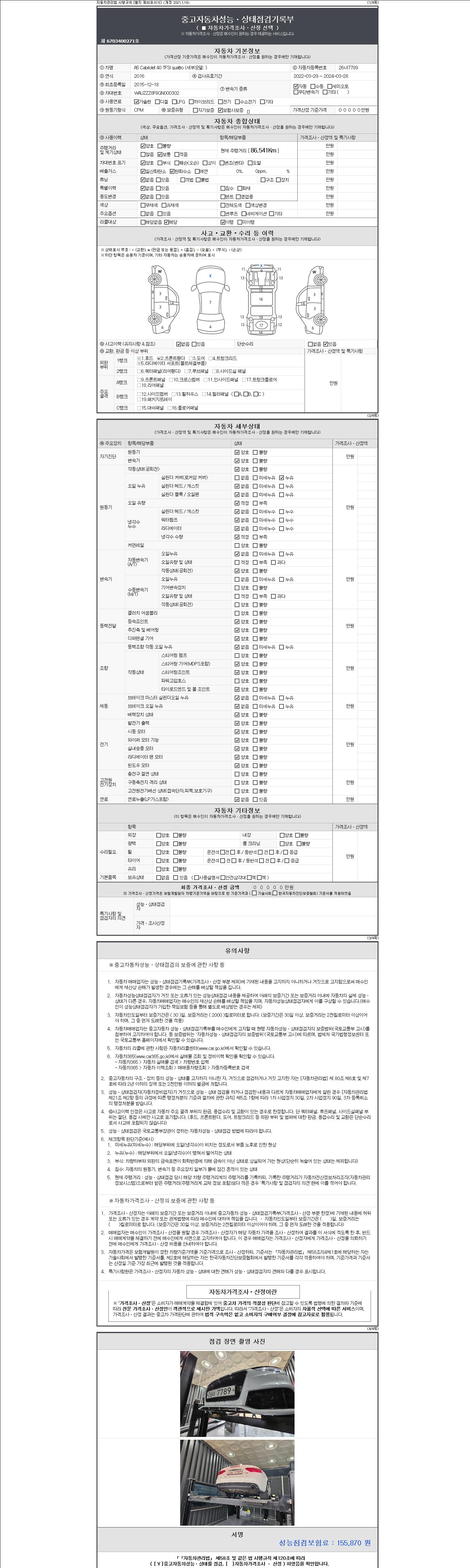 -중고자동차 매매업자를 통해 차량을 구입하실 경우 반드시 "중고자동차 성능, 상태점검 기록부"를 교뷰 받으셔야 하며, 매매업자는 반드시 의무 교부 하여야 압니다.