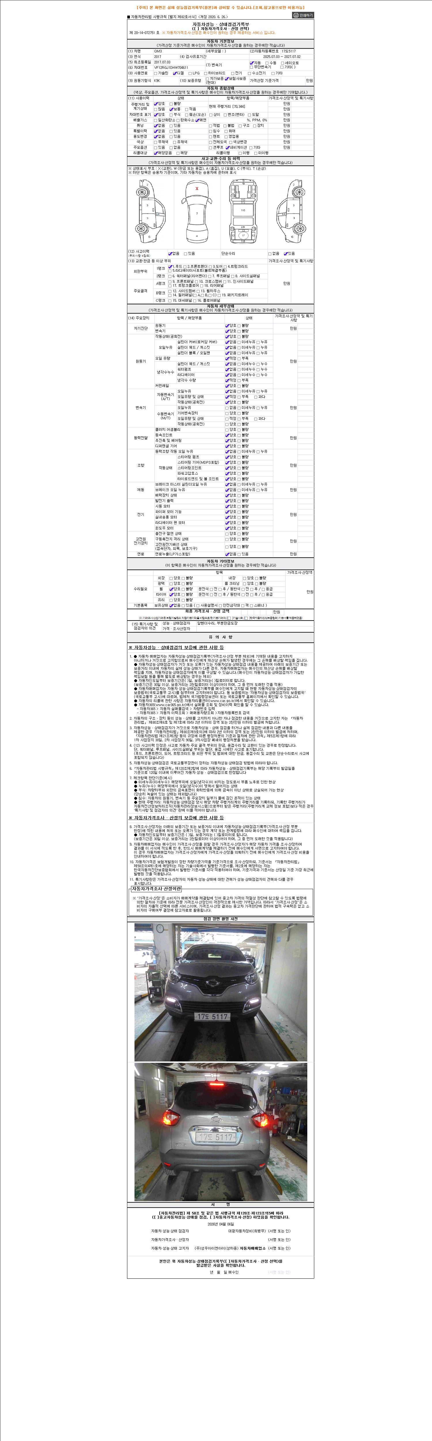 | 주행거리 | 70,344 km | 차량번호 | 17도5117 | 사고유무 | 성능기록부 참조 | 제시번호 | 제 2026043419 호 |