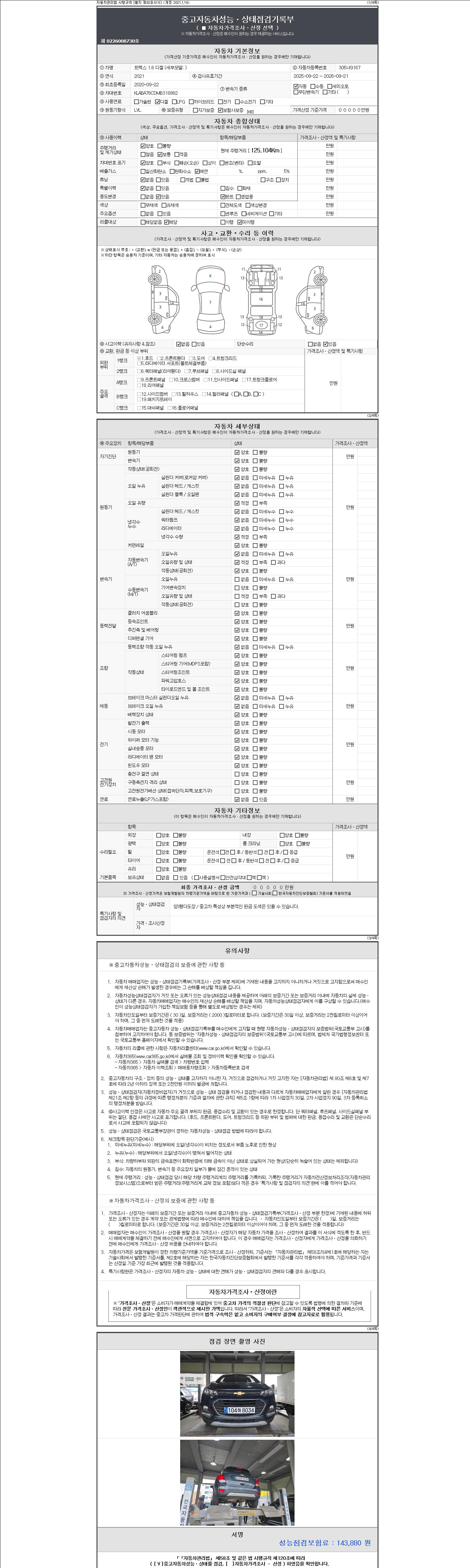 자동차관리법 시행규칙 제120조의 규정에 따라 별지 제 82호서식 《중고자동차 성능, 상태점검 기록부》를 발행한 성능, 상태점검자 및 매매자는 아래의 보증기간 또는 보증거리 이내의 중고자동차, 성능점검 기록부에 기재된 내용과 자동차의 실제 성능, 상태가 다른 경우 계약 또는 관계법령에 따라 매수인에 대하여 책임을 집니다.