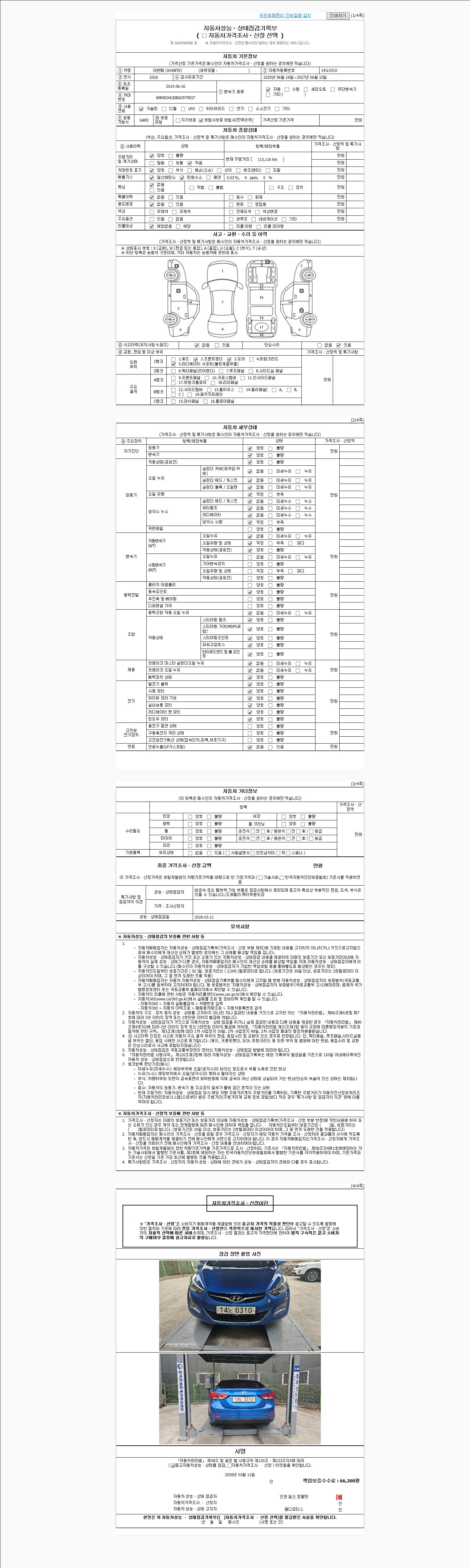 | 주행거리 | 113,116 km | 차량번호 | 14노0310 | 사고유무 | 성능기록부 참조 | 제시번호 | 제 2026011601 호 |