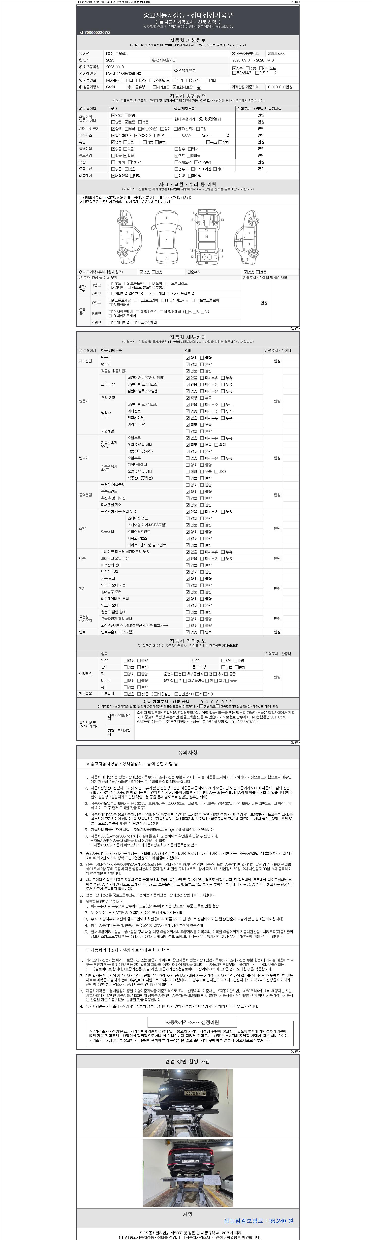 | 주행거리 | 62,883 km | 차량번호 | 239보8206 | 사고유무 | 성능기록부 참조 | 제시번호 | 제 2147483647 호 |