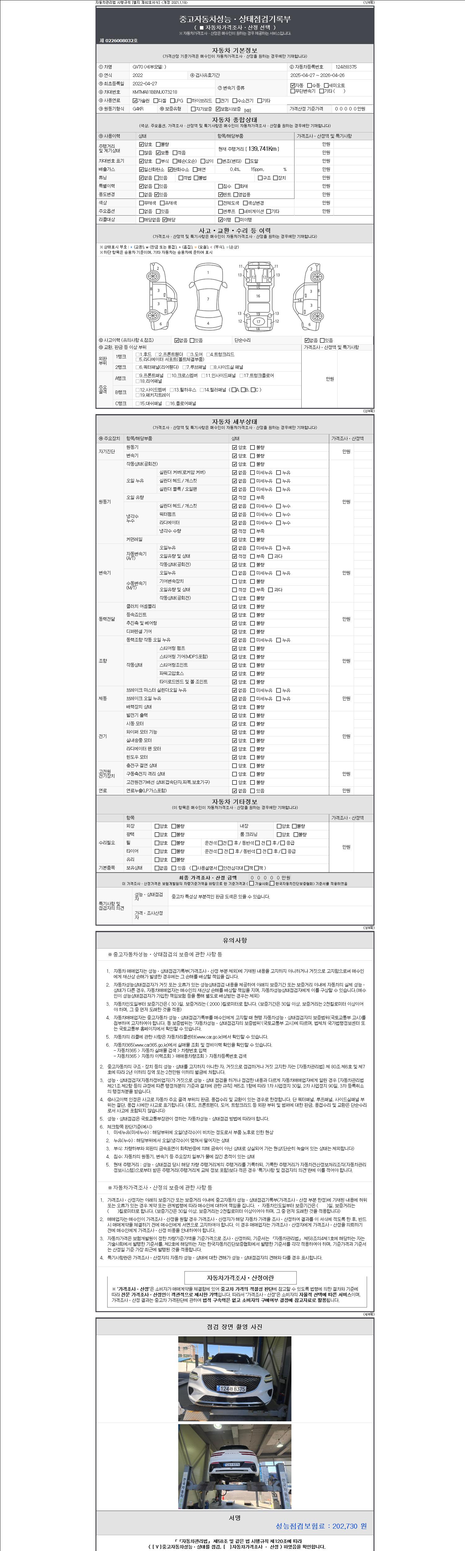 | 주행거리 | 139,741 km | 차량번호 | 124러8375 | 사고유무 | 성능기록부 참조 | 제시번호 | 제 2147483647 호 |