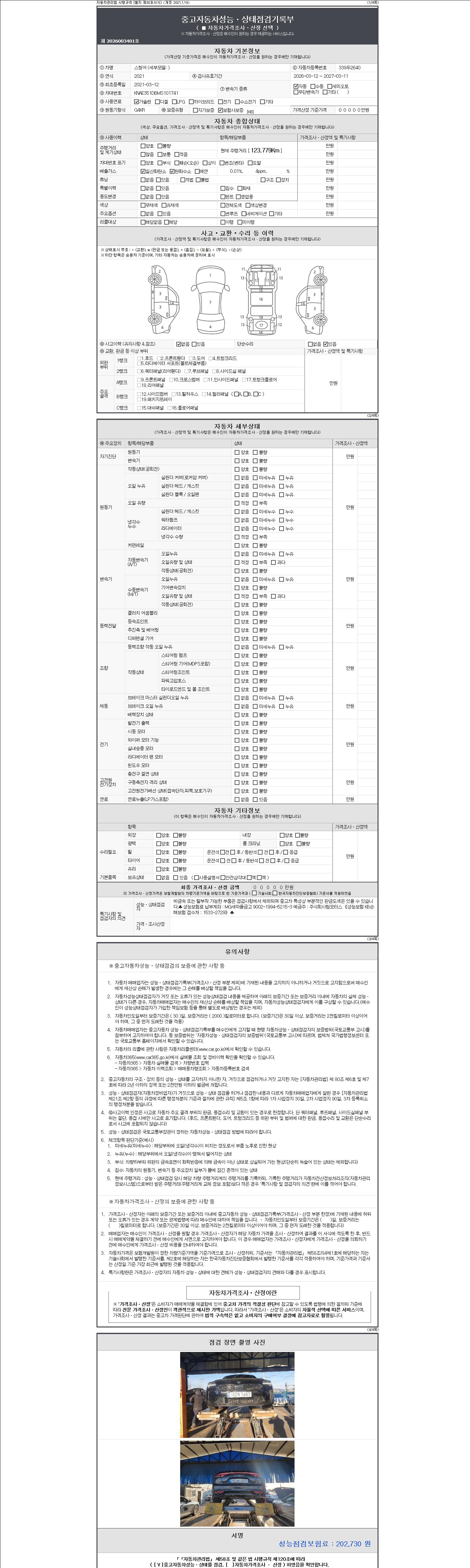 자동차관리법 시행규칙 제120조의 규정에 따라 별지 제 82호서식 《중고자동차 성능, 상태점검 기록부》를 발행한 성능, 상태점검자 및 매매자는 아래의 보증기간 또는 보증거리 이내의 중고자동차, 성능점검 기록부에 기재된 내용과 자동차의 실제 성능, 상태가 다른 경우 계약 또는 관계법령에 따라 매수인에 대하여 책임을 집니다.