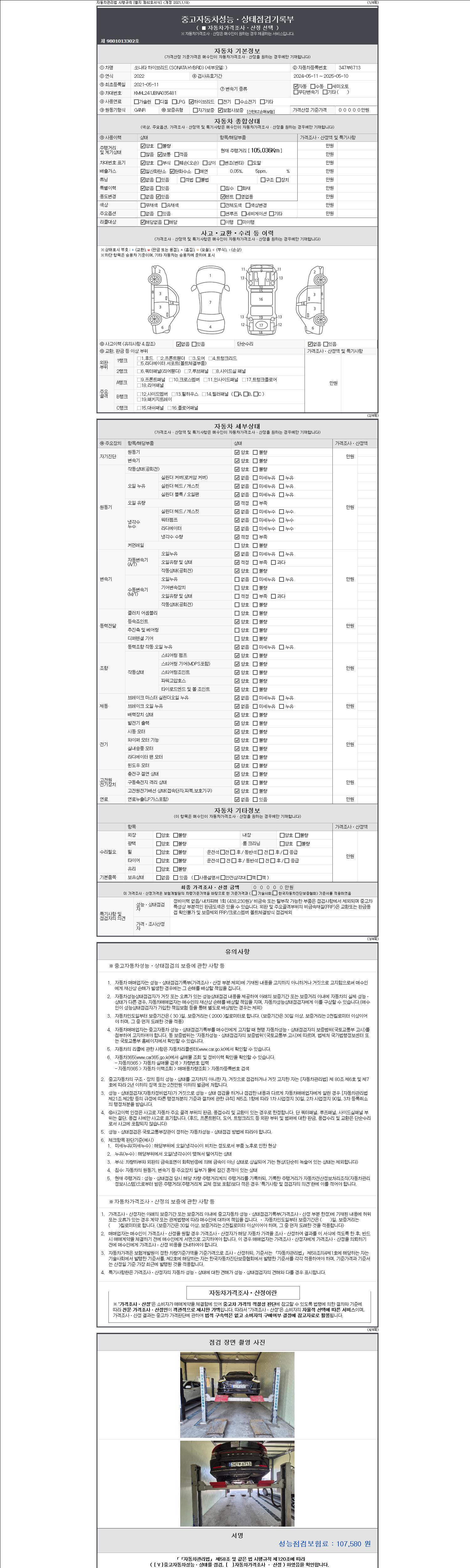 | 주행거리 | 105,036 km | 차량번호 | 347부6713 | 사고유무 | 성능기록부 참조 | 제시번호 | 제 2147483647 호 |